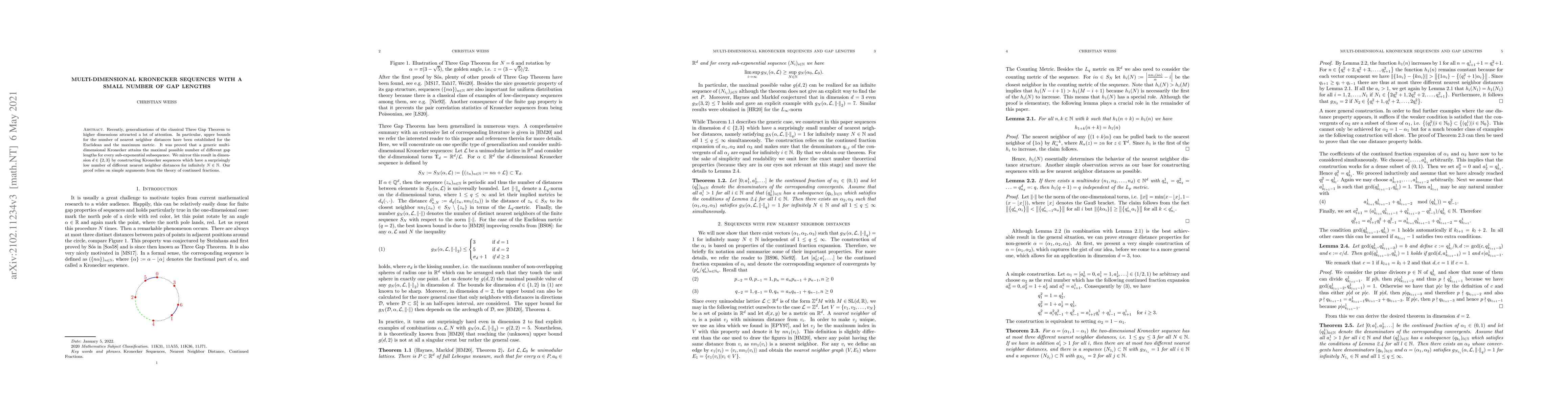 This paper constructs multi-dimensional Kronecker sequences in dimensions 2 and 3 that surprisingly exhibit a small number of different nearest neighbor distances, contrasting with the maximal number expected. The proof leverages continued fractions theory.