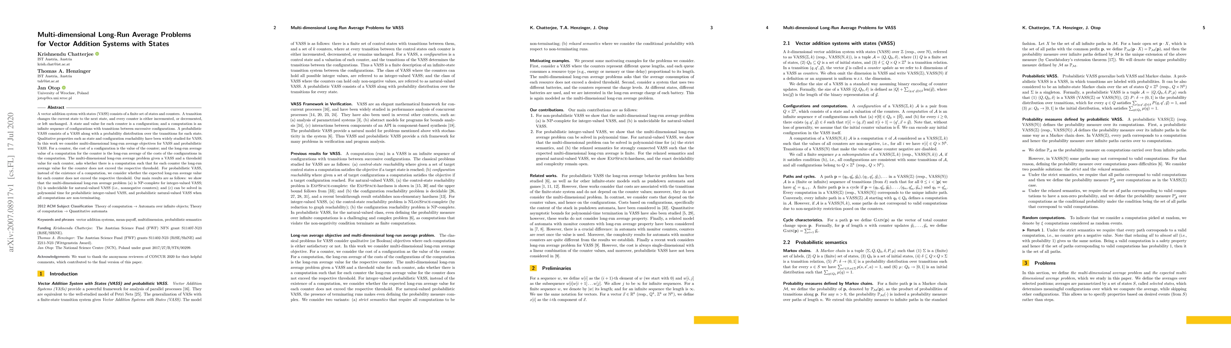 A vector addition system with states (VASS) consists of a finite set of states and counters. A transition changes the current state to the next state, and every counter is either incremented, or decremented, or left unchanged. A state and value for each counter is a configuration; and a computation is an infinite sequence of configurations with transitions between successive configurations. A probabilistic VASS consists of a VASS along with a probability distribution over the transitions for each state. Qualitative properties such as state and configuration reachability have been widely studied for VASS. In this work we consider multi-dimensional long-run average objectives for VASS and probabilistic VASS. For a counter, the cost of a configuration is the value of the counter; and the long-run average value of a computation for the counter is the long-run average of the costs of the configurations in the computation. The multi-dimensional long-run average problem given a VASS and a threshold value for each counter, asks whether there is a computation such that for each counter the long-run average value for the counter does not exceed the respective threshold. For probabilistic VASS, instead of the existence of a computation, we consider whether the expected long-run average value for each counter does not exceed the respective threshold. Our main results are as follows: we show that the multi-dimensional long-run average problem (a) is NP-complete for integer-valued VASS; (b) is undecidable for natural-valued VASS (i.e., nonnegative counters); and (c) can be solved in polynomial time for probabilistic integer-valued VASS, and probabilistic natural-valued VASS when all computations are non-terminating.