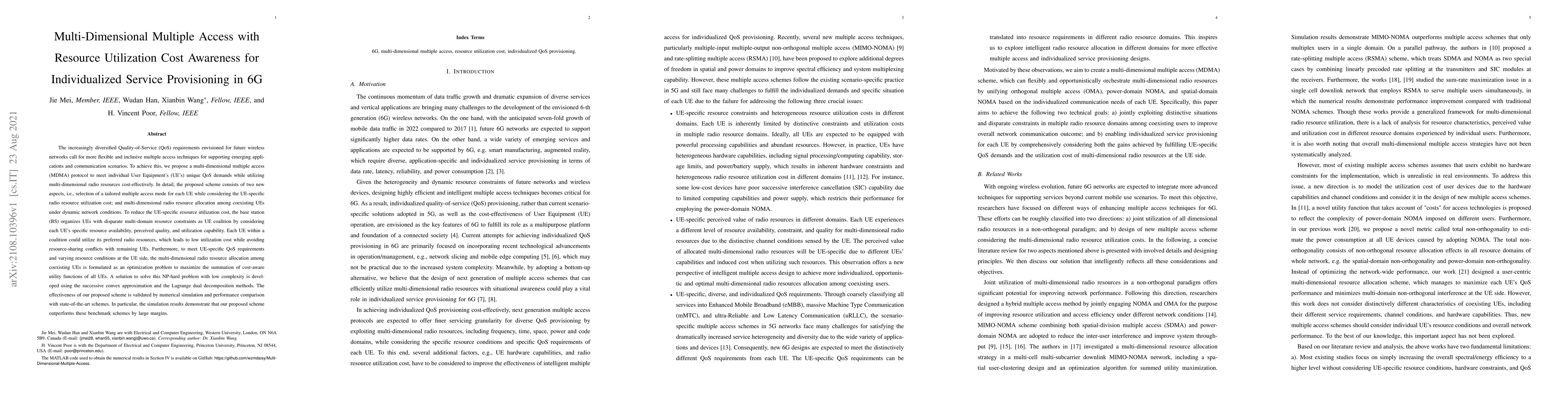 The paper proposes a multi-dimensional multiple access (MDMA) protocol for 6G networks to meet individual User Equipment's unique QoS demands by selecting tailored access modes and optimizing multi-dimensional resource allocation. The scheme reduces UE-specific resource utilization cost through UE coalitions and solves an NP-hard optimization problem to maximize cost-aware utility functions, outperforming state-of-the-art methods in simulations.