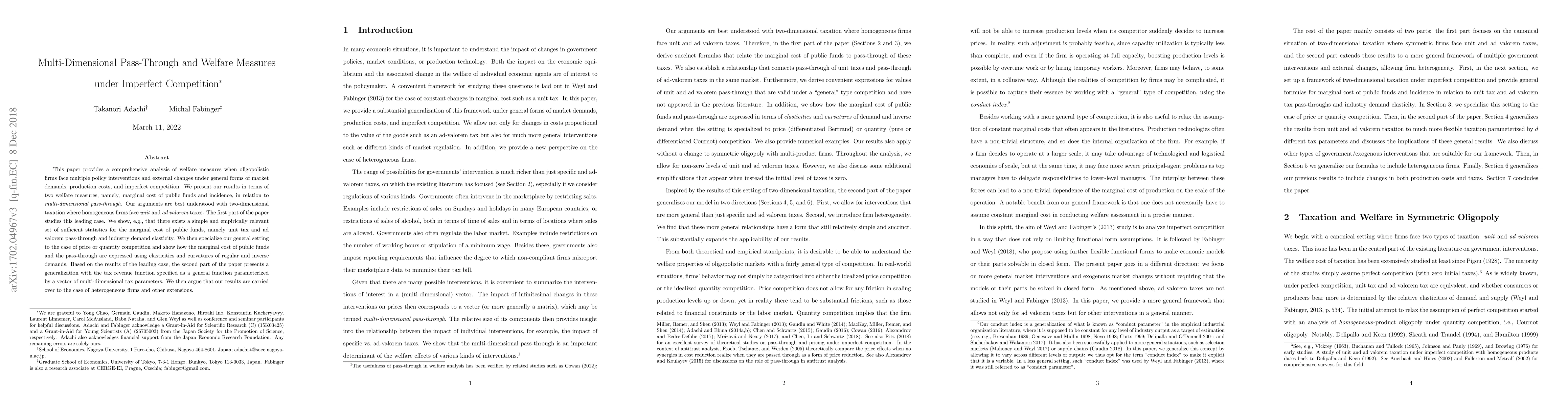 This paper provides a comprehensive analysis of welfare measures when oligopolistic firms face multiple policy interventions and external changes under general forms of market demands, production costs, and imperfect competition. We present our results in terms of two welfare measures, namely, marginal cost of public funds and incidence, in relation to multi-dimensional pass-through. Our arguments are best understood with two-dimensional taxation where homogeneous firms face unit and ad valorem taxes. The first part of the paper studies this leading case. We show, e.g., that there exists a simple and empirically relevant set of sufficient statistics for the marginal cost of public funds, namely unit tax and ad valorem pass-through and industry demand elasticity. We then specialize our general setting to the case of price or quantity competition and show how the marginal cost of public funds and the pass-through are expressed using elasticities and curvatures of regular and inverse demands. Based on the results of the leading case, the second part of the paper presents a generalization with the tax revenue function specified as a general function parameterized by a vector of multi-dimensional tax parameters. We then argue that our results are carried over to the case of heterogeneous firms and other extensions.