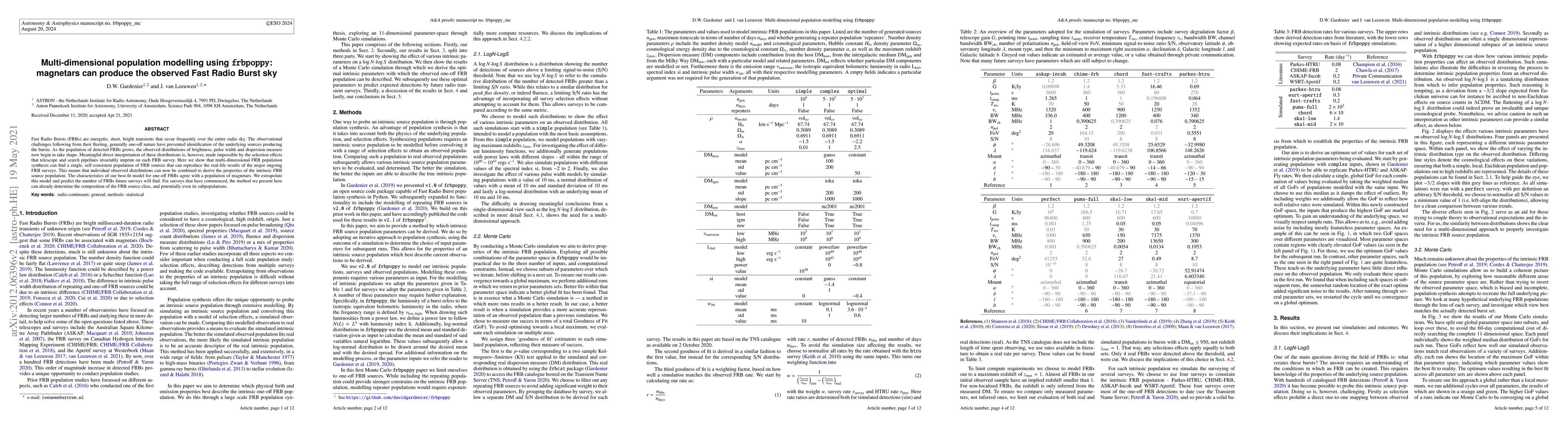 This research introduces a method using frbpoppy for multi-dimensional Fast Radio Burst (FRB) population modeling, revealing that magnetars likely produce the observed FRBs. The method combines individual survey results to derive intrinsic FRB source properties, predicts future FRB discoveries, and identifies potential FRB source subpopulations.