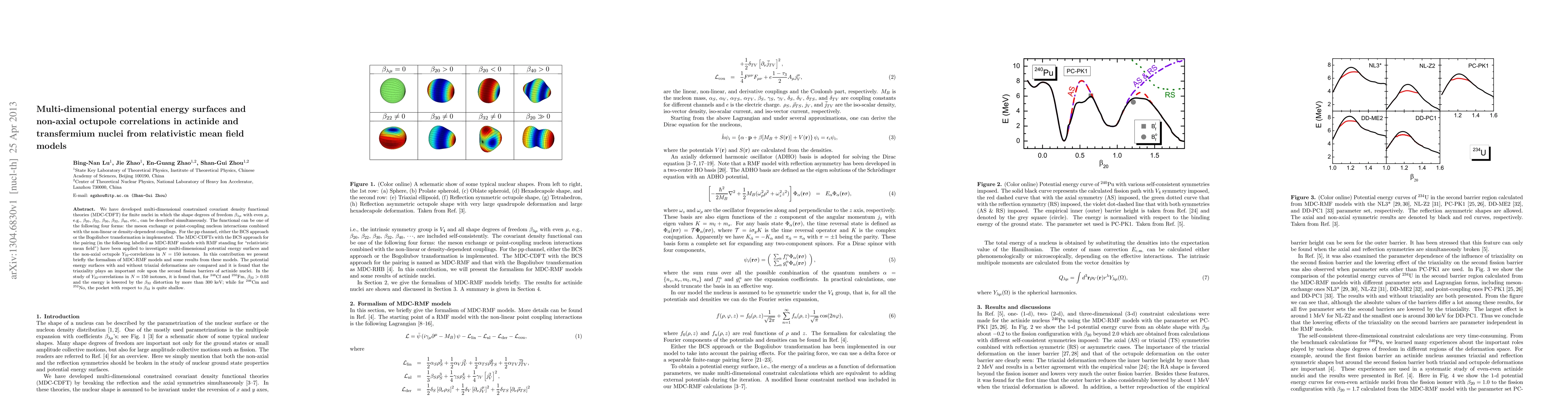 We have developed multi-dimensional constrained covariant density functional theories (MDC-CDFT) for finite nuclei in which the shape degrees of freedom \beta_{\lambda\mu} with even \mu, e.g., \beta_{20}, \beta_{22}, \beta_{30}, \beta_{32}, \beta_{40}, etc., can be described simultaneously. The functional can be one of the following four forms: the meson exchange or point-coupling nucleon interactions combined with the non-linear or density-dependent couplings. For the pp channel, either the BCS approach or the Bogoliubov transformation is implemented. The MDC-CDFTs with the BCS approach for the pairing (in the following labelled as MDC-RMF models with RMF standing for "relativistic mean field") have been applied to investigate multi-dimensional potential energy surfaces and the non-axial octupole $Y_{32}$-correlations in N=150 isotones. In this contribution we present briefly the formalism of MDC-RMF models and some results from these models. The potential energy surfaces with and without triaxial deformations are compared and it is found that the triaxiality plays an important role upon the second fission barriers of actinide nuclei. In the study of Y_{32}-correlations in N=150 isotones, it is found that, for 248Cf and 250Fm, \beta_{32} > 0.03 and the energy is lowered by the \beta_{32} distortion by more than 300 keV; while for 246Cm and 252No, the pocket with respect to \beta_{32} is quite shallow.