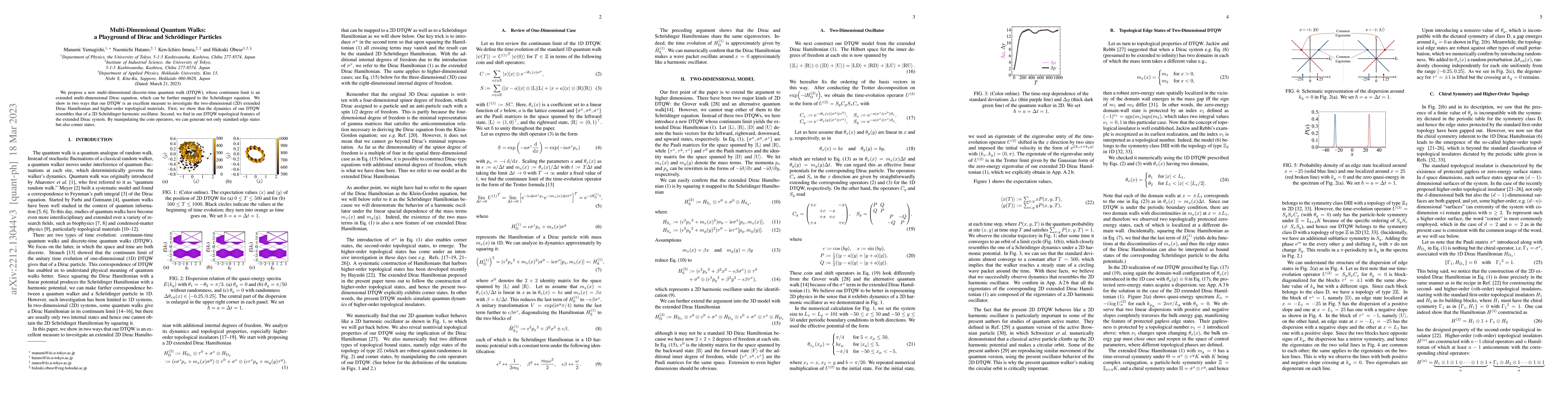 This paper introduces a novel multi-dimensional quantum walk whose continuum limit corresponds to an extended Dirac equation and can be mapped to the Schrödinger equation. The proposed quantum walk effectively investigates topological features of extended Dirac systems and higher-order topological materials, demonstrating both harmonic oscillator dynamics and unique edge and corner states.