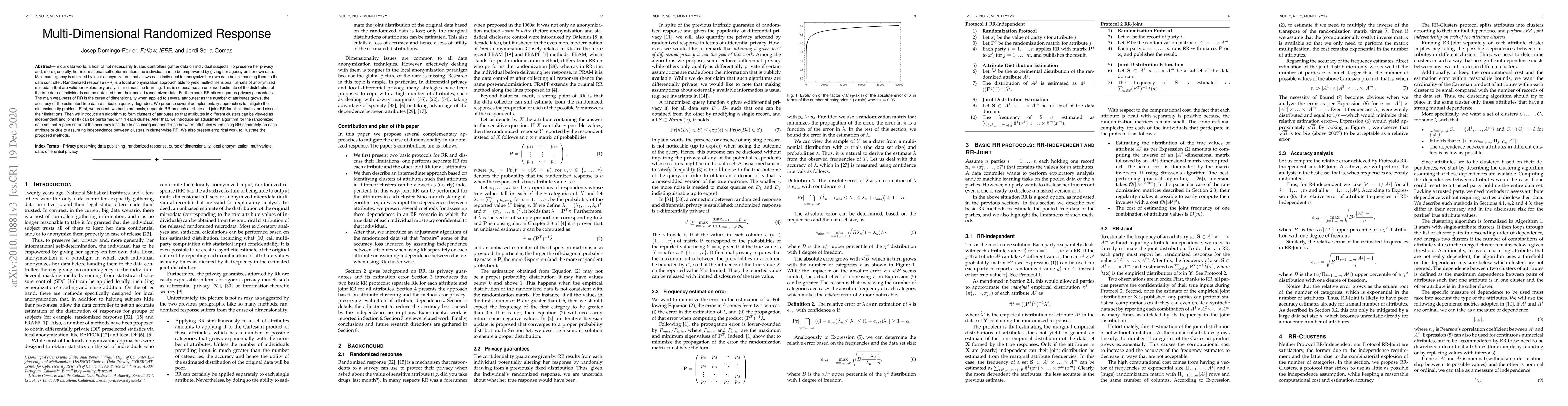 This paper proposes methods to enhance the randomized response (RR) technique for multi-dimensional data anonymization, addressing the accuracy loss due to the curse of dimensionality. It introduces protocols for separate and joint RR, a clustering algorithm for attribute independence, and an adjustment method to improve accuracy, supported by empirical validation.