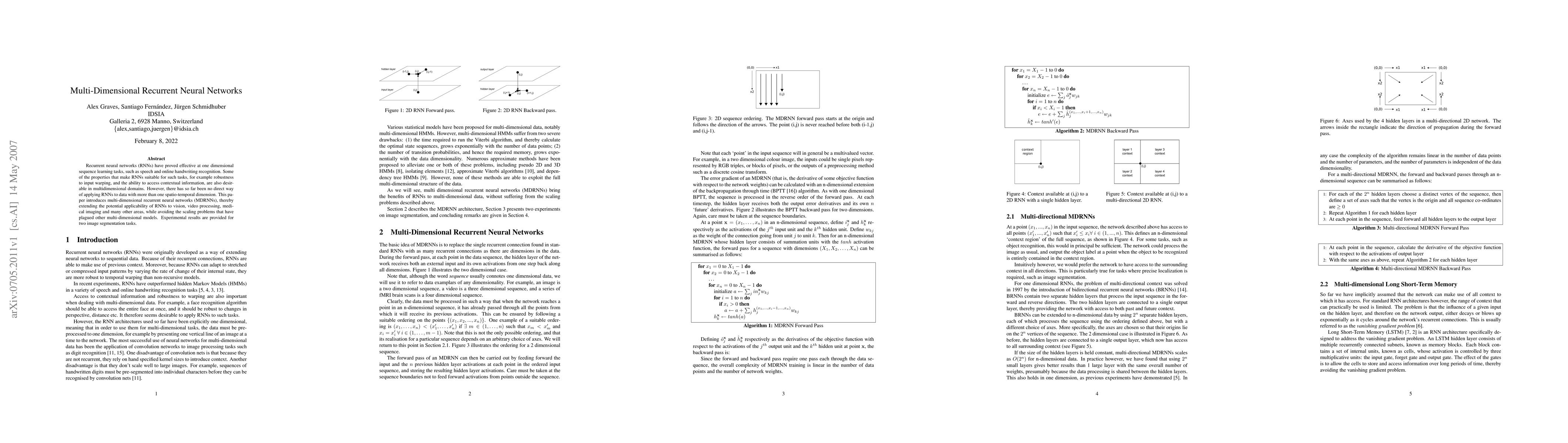 This paper introduces multi-dimensional recurrent neural networks (MDRNNs) to extend the applicability of RNNs to multidimensional domains like vision and medical imaging, while avoiding scaling issues. Experimental results demonstrate MDRNNs' effectiveness in image segmentation tasks.