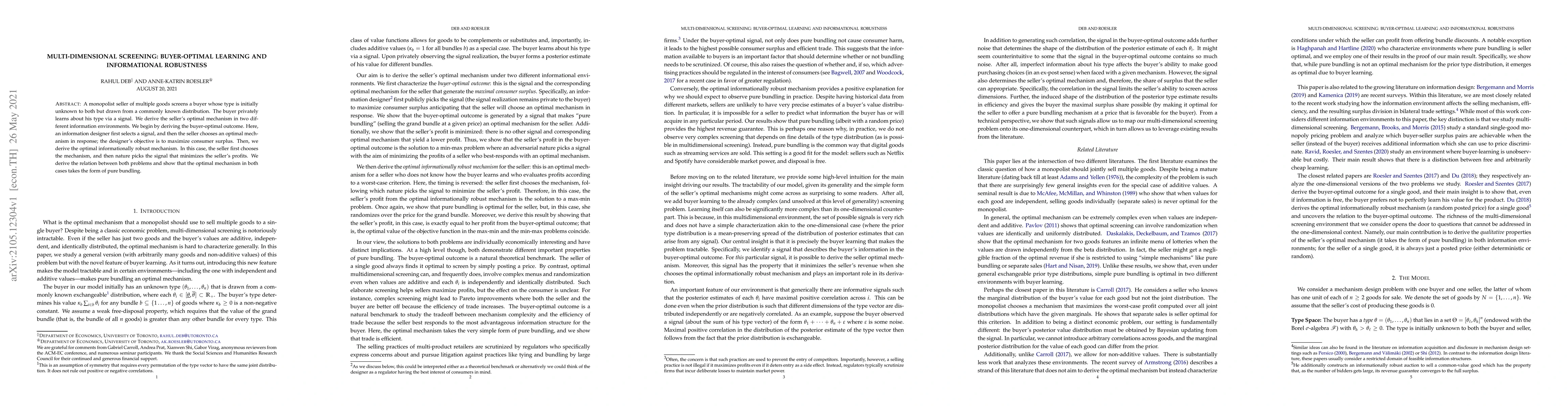 A monopolist seller of multiple goods screens a buyer whose type is initially unknown to both but drawn from a commonly known distribution. The buyer privately learns about his type via a signal. We derive the seller's optimal mechanism in two different information environments. We begin by deriving the buyer-optimal outcome. Here, an information designer first selects a signal, and then the seller chooses an optimal mechanism in response; the designer's objective is to maximize consumer surplus. Then, we derive the optimal informationally robust mechanism. In this case, the seller first chooses the mechanism, and then nature picks the signal that minimizes the seller's profits. We derive the relation between both problems and show that the optimal mechanism in both cases takes the form of pure bundling.
