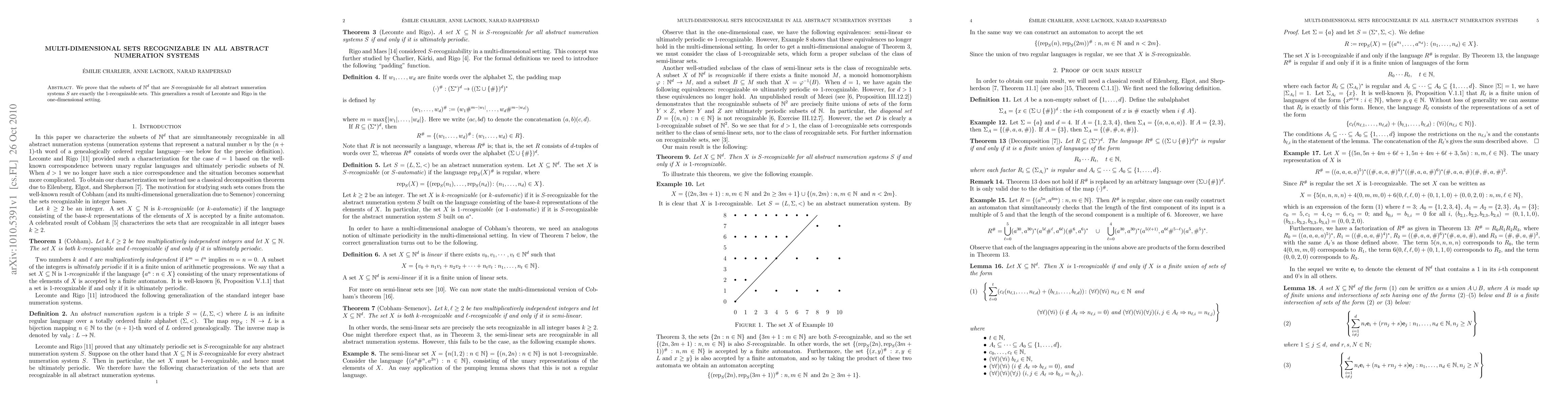 This paper proves that subsets of N^d recognizable in all abstract numeration systems are precisely the 1-recognizable sets, extending a prior result by Lecomte and Rigo to higher dimensions.