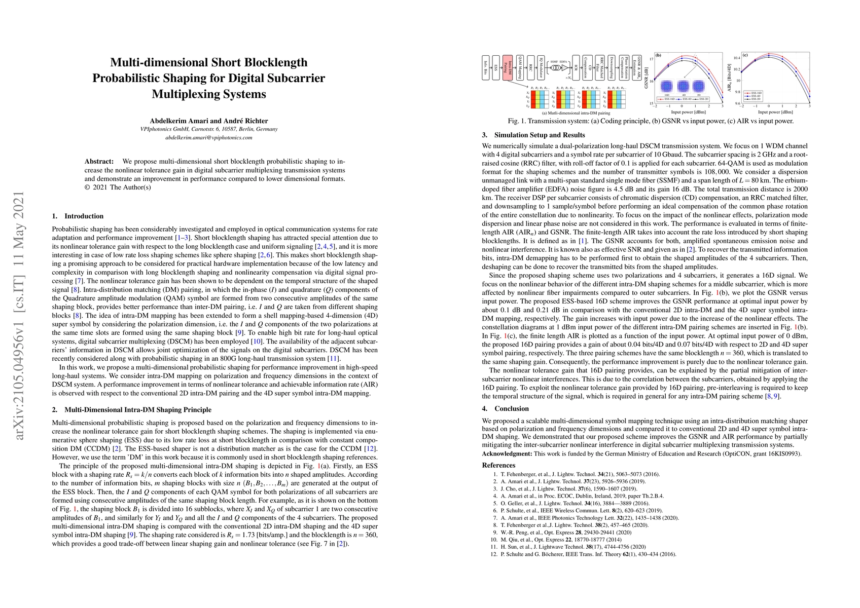 Summary: This paper introduces a multi-dimensional short blocklength probabilistic shaping technique to enhance nonlinear tolerance in digital subcarrier multiplexing systems, showing superior performance over lower dimensional formats. The method aims to improve system efficiency and robustness.