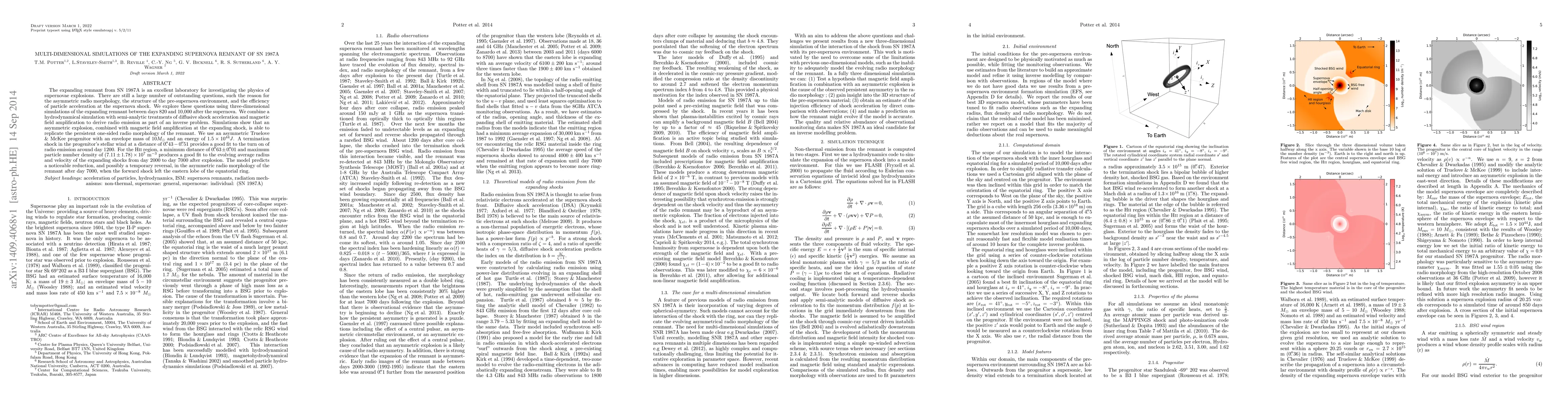 This paper uses multi-dimensional simulations to investigate the expanding supernova remnant of SN 1987A, focusing on its asymmetric radio morphology and the efficiency of particle acceleration. The simulations suggest that an asymmetric explosion and magnetic field amplification can replicate the observed radio morphology.