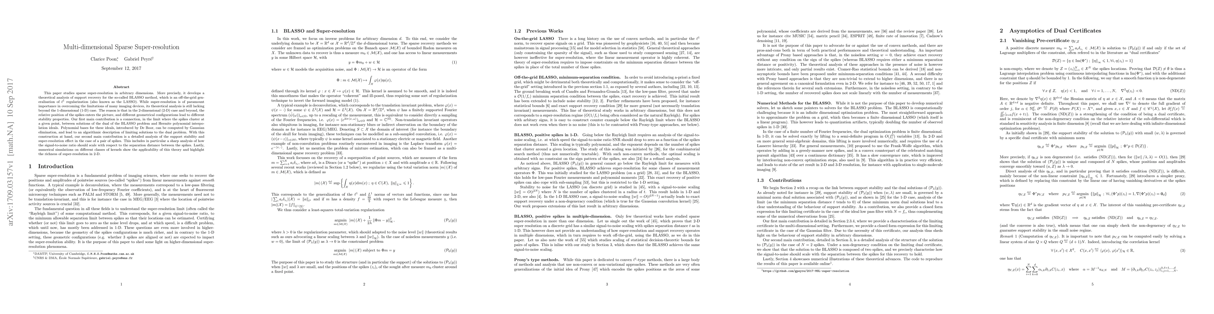 This paper studies sparse super-resolution in arbitrary dimensions. More precisely, it develops a theoretical analysis of support recovery for the so-called BLASSO method, which is an off-the-grid generalisation of l1 regularization (also known as the LASSO). While super-resolution is of paramount importance in overcoming the limitations of many imaging devices, its theoretical analysis is still lacking beyond the 1-dimensional (1-D) case. The reason is that in the 2-dimensional (2-D) case and beyond, the relative position of the spikes enters the picture, and different geometrical configurations lead to different stability properties. Our first main contribution is a connection, in the limit where the spikes cluster at a given point, between solutions of the dual of the BLASSO problem and Hermite polynomial interpolation ideals. Polynomial bases for these ideals, introduced by De Boor, can be computed by Gaussian elimination, and lead to an algorithmic description of limiting solutions to the dual problem. With this construction at hand, our second main contribution is a detailed analysis of the support stability and super-resolution effect in the case of a pair of spikes. This includes in particular a sharp analysis of how the signal-to-noise ratio should scale with respect to the separation distance between the spikes. Lastly, numerical simulations on different classes of kernels show the applicability of this theory and highlight the richness of super-resolution in 2-D.