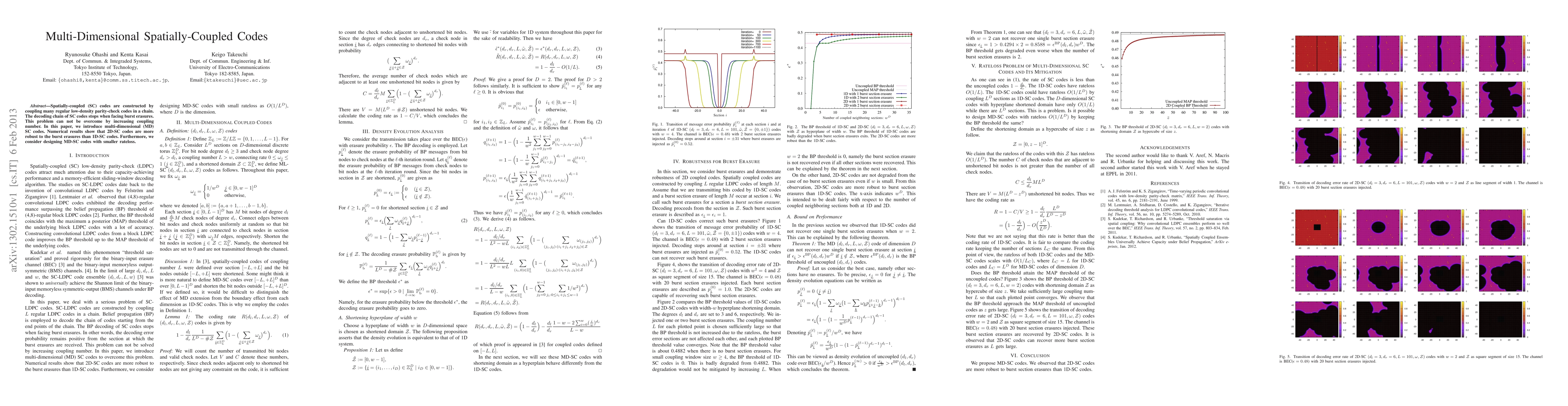 Spatially-coupled (SC) codes are constructed by coupling many regular low-density parity-check codes in a chain. The decoding chain of SC codes stops when facing burst erasures. This problem can not be overcome by increasing coupling number. In this paper, we introduce multi-dimensional (MD) SC codes. Numerical results show that 2D-SC codes are more robust to the burst erasures than 1D-SC codes. Furthermore, we consider designing MD-SC codes with smaller rateloss.