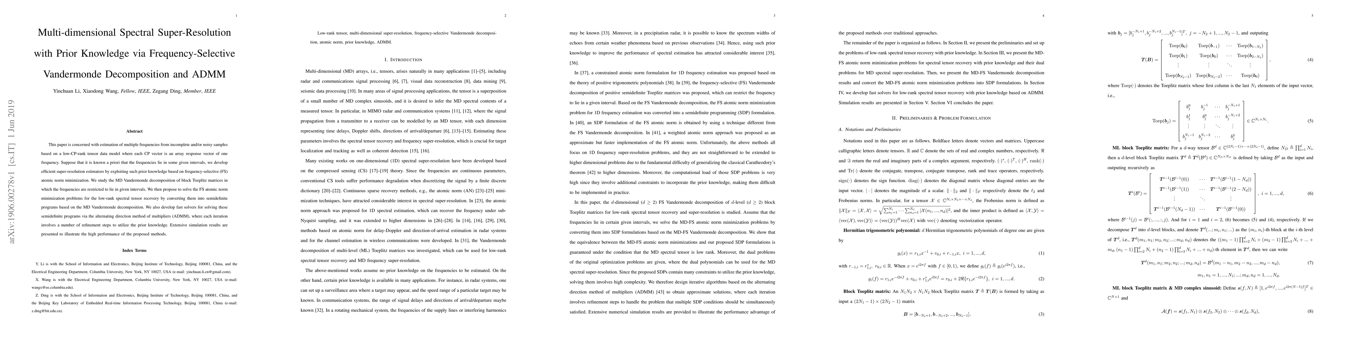 This paper is concerned with estimation of multiple frequencies from incomplete and/or noisy samples based on a low-CP-rank tensor data model where each CP vector is an array response vector of one frequency. Suppose that it is known a priori that the frequencies lie in some given intervals, we develop efficient super-resolution estimators by exploiting such prior knowledge based on frequency-selective (FS) atomic norm minimization. We study the MD Vandermonde decomposition of block Toeplitz matrices in which the frequencies are restricted to lie in given intervals. We then propose to solve the FS atomic norm minimization problems for the low-rank spectral tensor recovery by converting them into semidefinite programs based on the MD Vandermonde decomposition. We also develop fast solvers for solving these semidefinite programs via the alternating direction method of multipliers (ADMM), where each iteration involves a number of refinement steps to utilize the prior knowledge. Extensive simulation results are presented to illustrate the high performance of the proposed methods.