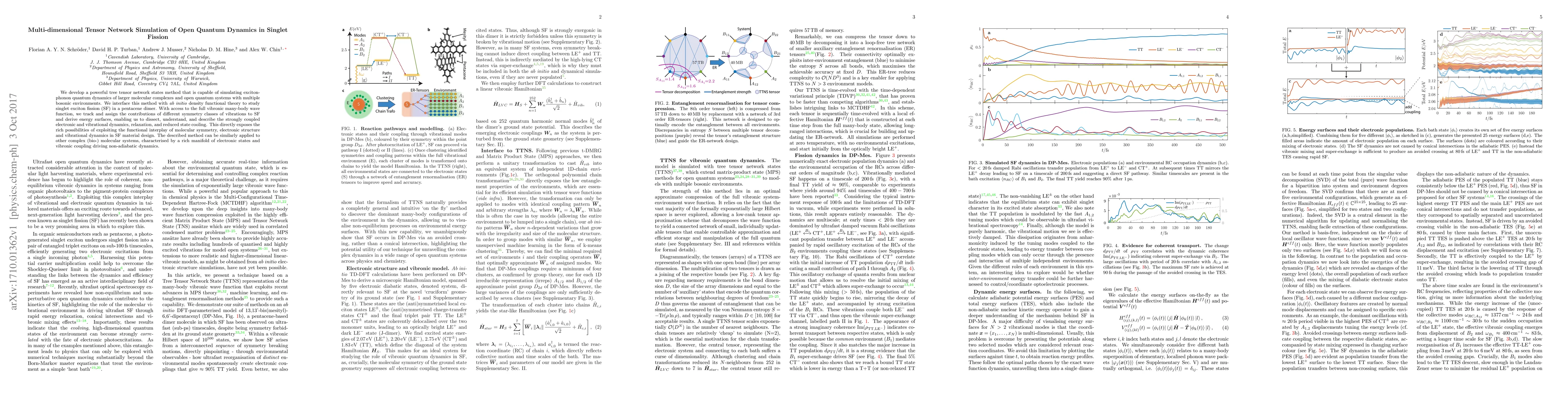 We develop a powerful tree tensor network states method that is capable of simulating exciton-phonon quantum dynamics of larger molecular complexes and open quantum systems with multiple bosonic environments. We interface this method with ab initio density functional theory to study singlet exciton fission (SF) in a pentacene dimer. With access to the full vibronic many-body wave function, we track and assign the contributions of different symmetry classes of vibrations to SF and derive energy surfaces, enabling us to dissect, understand, and describe the strongly coupled electronic and vibrational dynamics, relaxation, and reduced state cooling. This directly exposes the rich possibilities of exploiting the functional interplay of molecular symmetry, electronic structure and vibrational dynamics in SF material design. The described method can be similarly applied to other complex (bio-) molecular systems, characterised by a rich manifold of electronic states and vibronic coupling driving non-adiabatic dynamics.