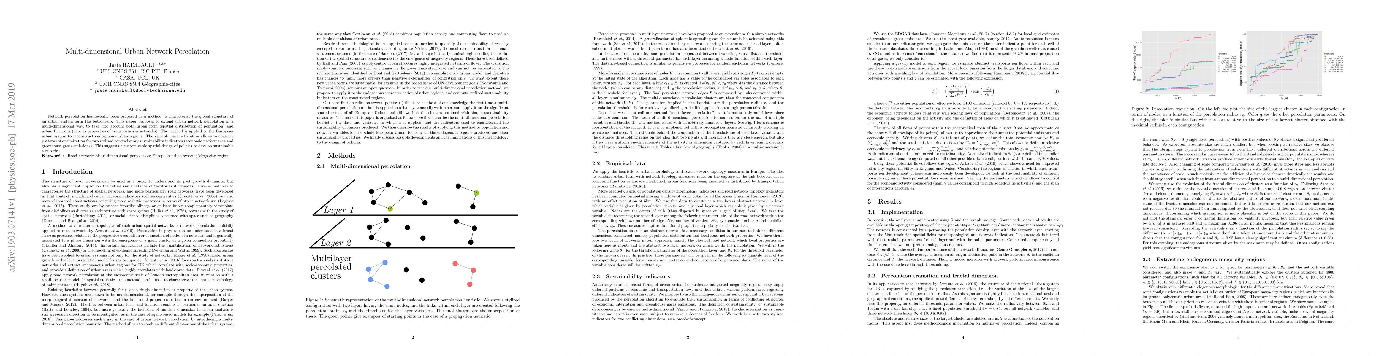 Network percolation has recently been proposed as a method to characterize the global structure of an urban system form the bottom-up. This paper proposes to extend urban network percolation in a multi-dimensional way, to take into account both urban form (spatial distribution of population) and urban functions (here as properties of transportation networks). The method is applied to the European urban system to reconstruct endogenous urban regions. The variable parametrization allows to consider patterns of optimization for two stylized contradictory sustainability indicators (economic performance and greenhouse gases emissions). This suggests a customizable spatial design of policies to develop sustainable territories.