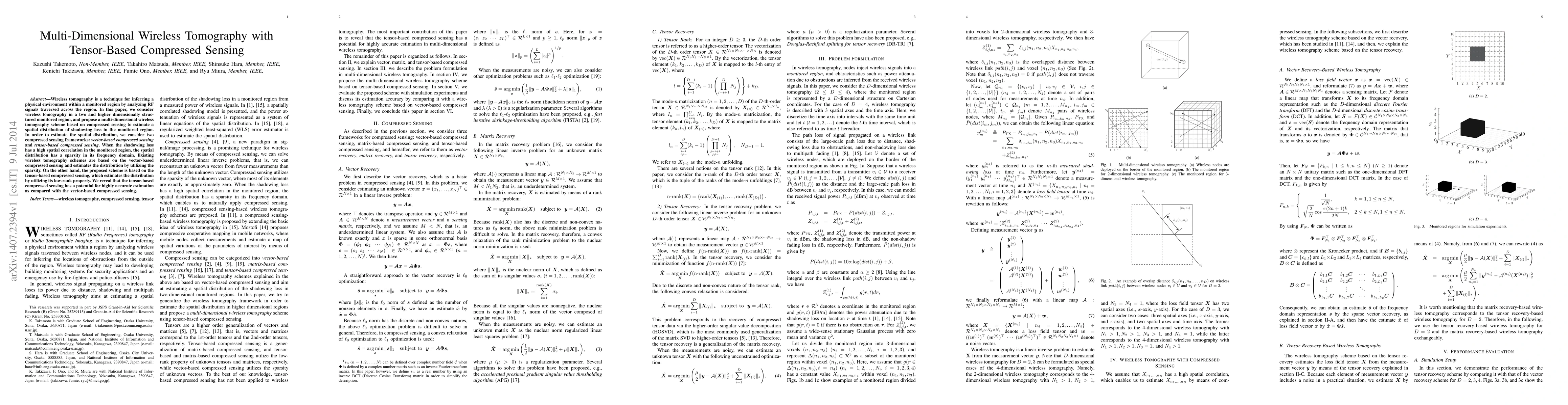 Wireless tomography is a technique for inferring a physical environment within a monitored region by analyzing RF signals traversed across the region. In this paper, we consider wireless tomography in a two and higher dimensionally structured monitored region, and propose a multi-dimensional wireless tomography scheme based on compressed sensing to estimate a spatial distribution of shadowing loss in the monitored region. In order to estimate the spatial distribution, we consider two compressed sensing frameworks: vector-based compressed sensing and tensor-based compressed sensing. When the shadowing loss has a high spatial correlation in the monitored region, the spatial distribution has a sparsity in its frequency domain. Existing wireless tomography schemes are based on the vector-based compressed sensing and estimates the distribution by utilizing the sparsity. On the other hand, the proposed scheme is based on the tensor-based compressed sensing, which estimates the distribution by utilizing its low-rank property. We reveal that the tensor-based compressed sensing has a potential for highly accurate estimation as compared with the vector-based compressed sensing.