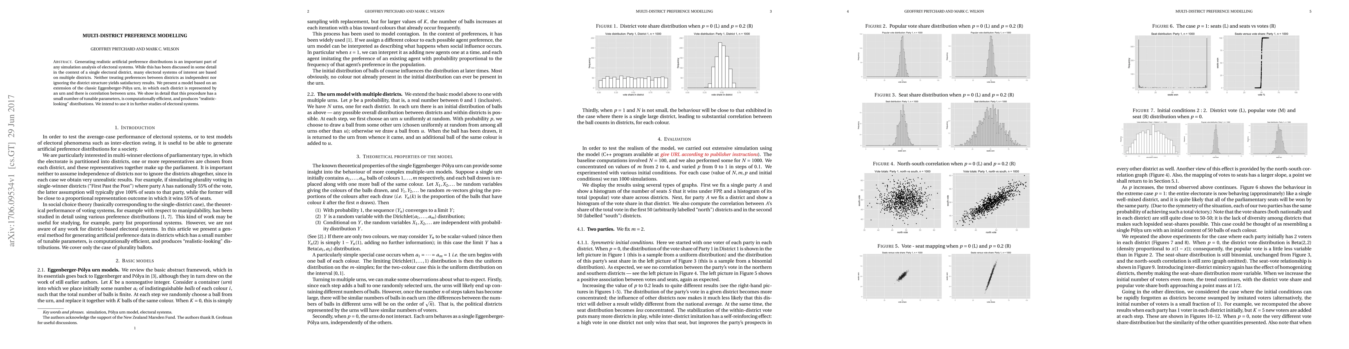 Generating realistic artificial preference distributions is an important part of any simulation analysis of electoral systems. While this has been discussed in some detail in the context of a single electoral district, many electoral systems of interest are based on multiple districts. Neither treating preferences between districts as independent nor ignoring the district structure yields satisfactory results. We present a model based on an extension of the classic Eggenberger-P\'olya urn, in which each district is represented by an urn and there is correlation between urns. We show in detail that this procedure has a small number of tunable parameters, is computationally efficient, and produces "realistic-looking" distributions. We intend to use it in further studies of electoral systems.