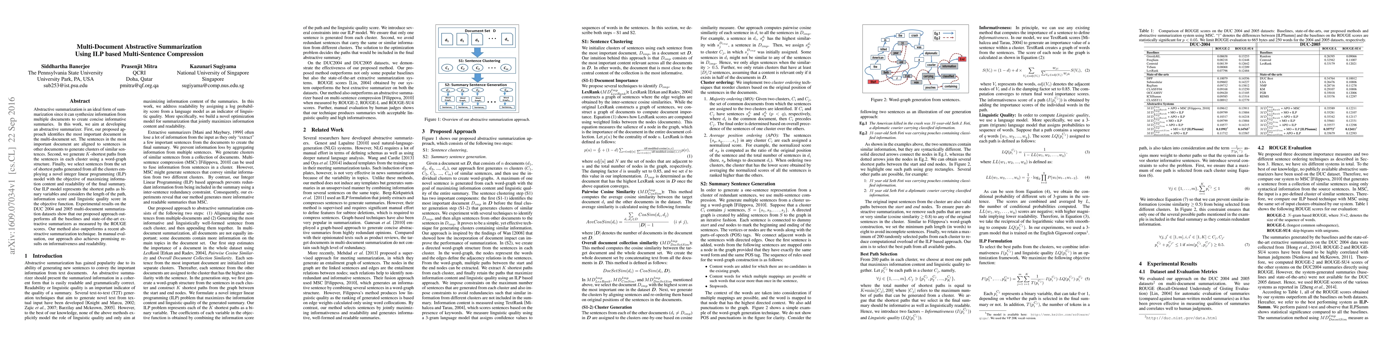 Abstractive summarization is an ideal form of summarization since it can synthesize information from multiple documents to create concise informative summaries. In this work, we aim at developing an abstractive summarizer. First, our proposed approach identifies the most important document in the multi-document set. The sentences in the most important document are aligned to sentences in other documents to generate clusters of similar sentences. Second, we generate K-shortest paths from the sentences in each cluster using a word-graph structure. Finally, we select sentences from the set of shortest paths generated from all the clusters employing a novel integer linear programming (ILP) model with the objective of maximizing information content and readability of the final summary. Our ILP model represents the shortest paths as binary variables and considers the length of the path, information score and linguistic quality score in the objective function. Experimental results on the DUC 2004 and 2005 multi-document summarization datasets show that our proposed approach outperforms all the baselines and state-of-the-art extractive summarizers as measured by the ROUGE scores. Our method also outperforms a recent abstractive summarization technique. In manual evaluation, our approach also achieves promising results on informativeness and readability.