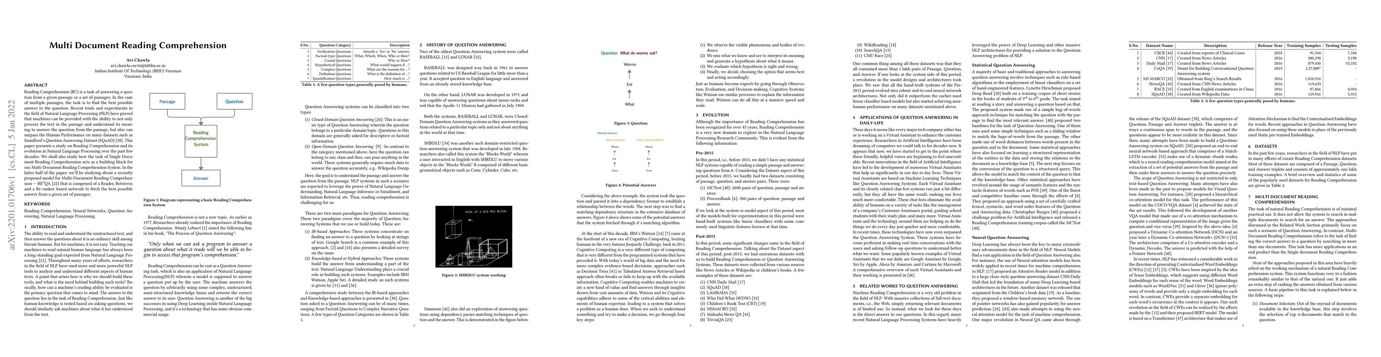 Reading Comprehension (RC) is a task of answering a question from a given passage or a set of passages. In the case of multiple passages, the task is to find the best possible answer to the question. Recent trials and experiments in the field of Natural Language Processing (NLP) have proved that machines can be provided with the ability to not only process the text in the passage and understand its meaning to answer the question from the passage, but also can surpass the Human Performance on many datasets such as Standford's Question Answering Dataset (SQuAD). This paper presents a study on Reading Comprehension and its evolution in Natural Language Processing over the past few decades. We shall also study how the task of Single Document Reading Comprehension acts as a building block for our Multi-Document Reading Comprehension System. In the latter half of the paper, we'll be studying about a recently proposed model for Multi-Document Reading Comprehension - RE3QA that is comprised of a Reader, Retriever, and a Re-ranker based network to fetch the best possible answer from a given set of passages.