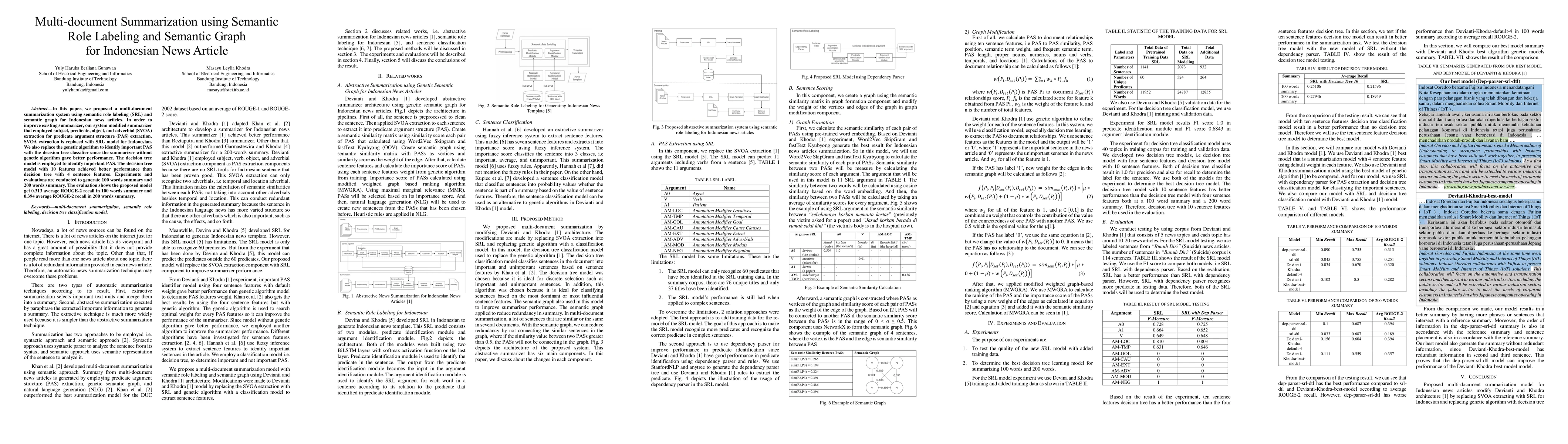 In this paper, we proposed a multi-document summarization system using semantic role labeling (SRL) and semantic graph for Indonesian news articles. In order to improve existing summarizer, our system modified summarizer that employed subject, predicate, object, and adverbial (SVOA) extraction for predicate argument structure (PAS) extraction. SVOA extraction is replaced with SRL model for Indonesian. We also replace the genetic algorithm to identify important PAS with the decision tree classifier since the summarizer without genetic algorithm gave better performance. The decision tree model is employed to identify important PAS. The decision tree model with 10 features achieved better performance than decision tree with 4 sentence features. Experiments and evaluations are conducted to generate 100 words summary and 200 words summary. The evaluation shows the proposed model get 0.313 average ROUGE-2 recall in 100 words summary and 0.394 average ROUGE-2 recall in 200 words summary.