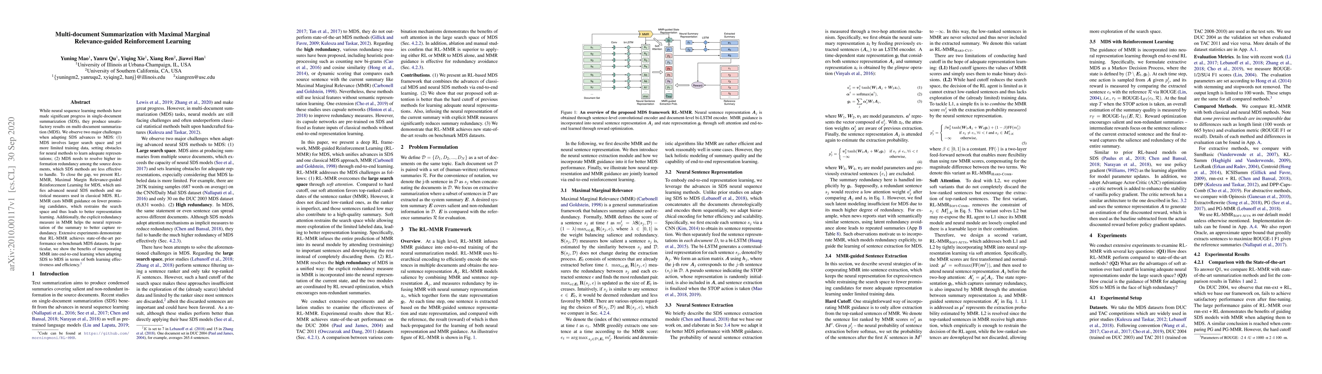 This paper introduces RL-MMR, a reinforcement learning approach that combines neural sequence learning with Maximal Marginal Relevance (MMR) to improve multi-document summarization. RL-MMR addresses challenges in adapting single-document summarization methods to multi-document summarization by reducing the search space and managing information redundancy, leading to state-of-the-art performance on benchmark datasets.