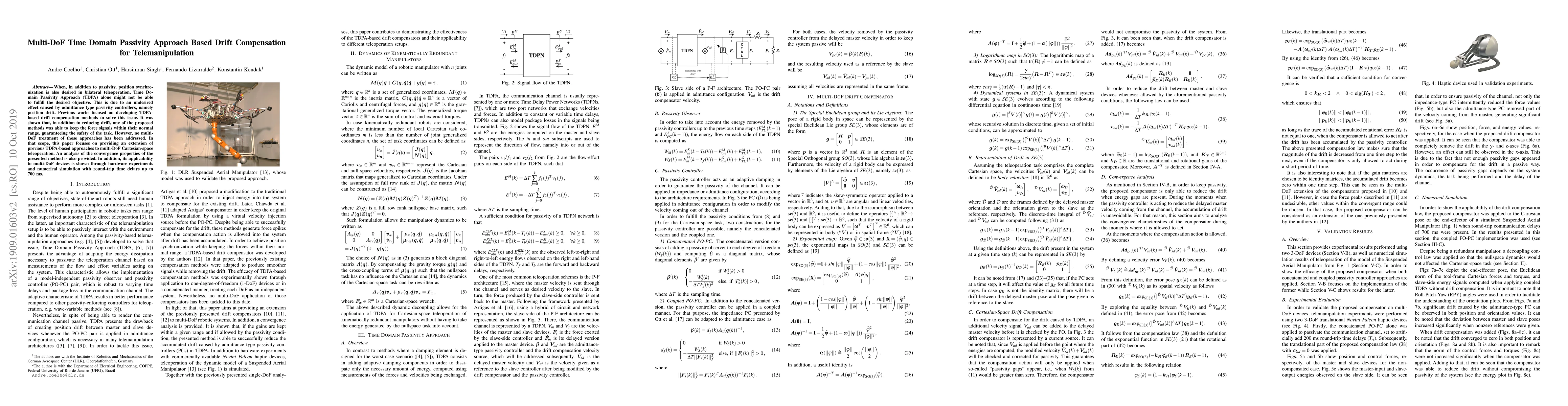 This paper extends Time Domain Passivity Approach (TDPA)-based drift compensation to multi-DoF Cartesian-space teleoperation, addressing position synchronization issues and ensuring force signal safety. The proposed method is validated through hardware experiments and simulations with delays up to 700 ms.