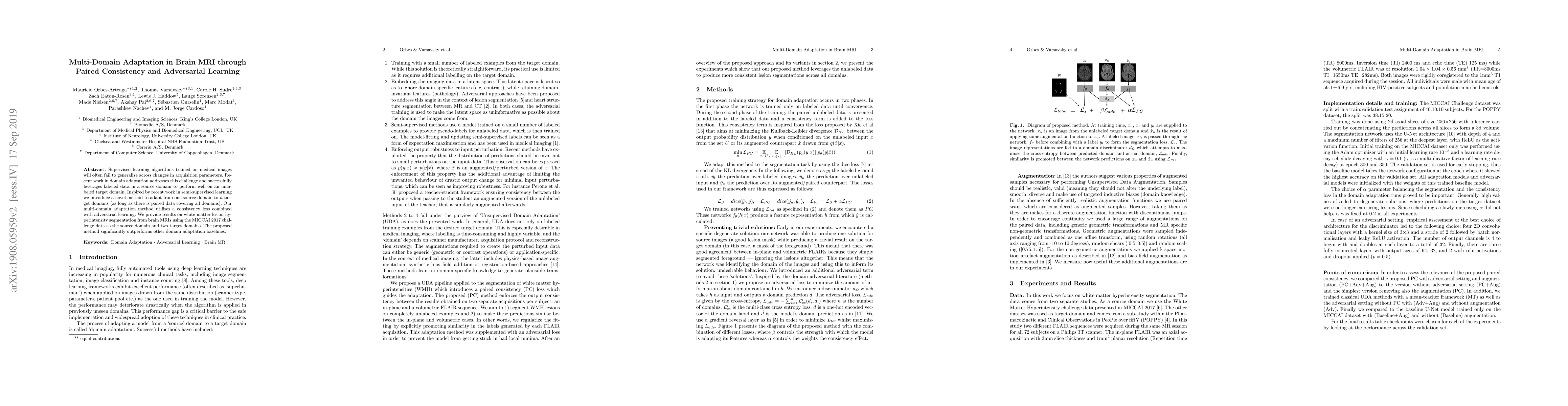 This paper introduces a novel multi-domain adaptation method for brain MRI segmentation that combines paired consistency loss with adversarial learning to improve generalization across different acquisition parameters. The method significantly outperforms other domain adaptation techniques on the MICCAI 2017 challenge data.