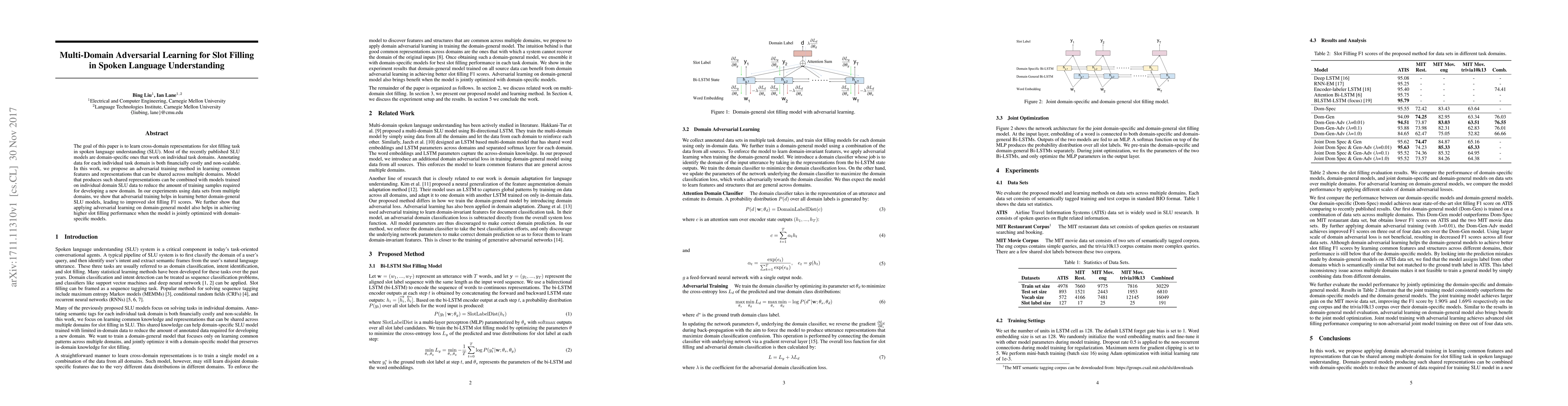This paper proposes an adversarial training method to learn cross-domain representations for slot filling in spoken language understanding, aiming to reduce the need for domain-specific annotations. The approach demonstrates improved slot filling performance by combining shared representations with domain-specific models.