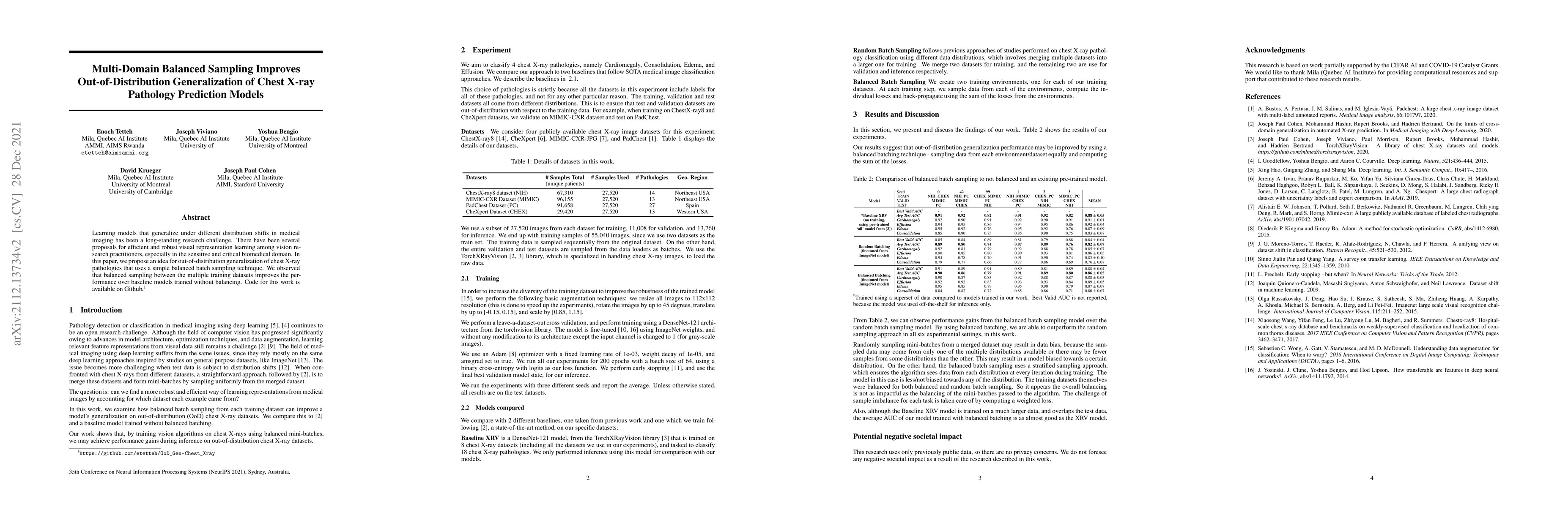 Learning models that generalize under different distribution shifts in medical imaging has been a long-standing research challenge. There have been several proposals for efficient and robust visual representation learning among vision research practitioners, especially in the sensitive and critical biomedical domain. In this paper, we propose an idea for out-of-distribution generalization of chest X-ray pathologies that uses a simple balanced batch sampling technique. We observed that balanced sampling between the multiple training datasets improves the performance over baseline models trained without balancing.