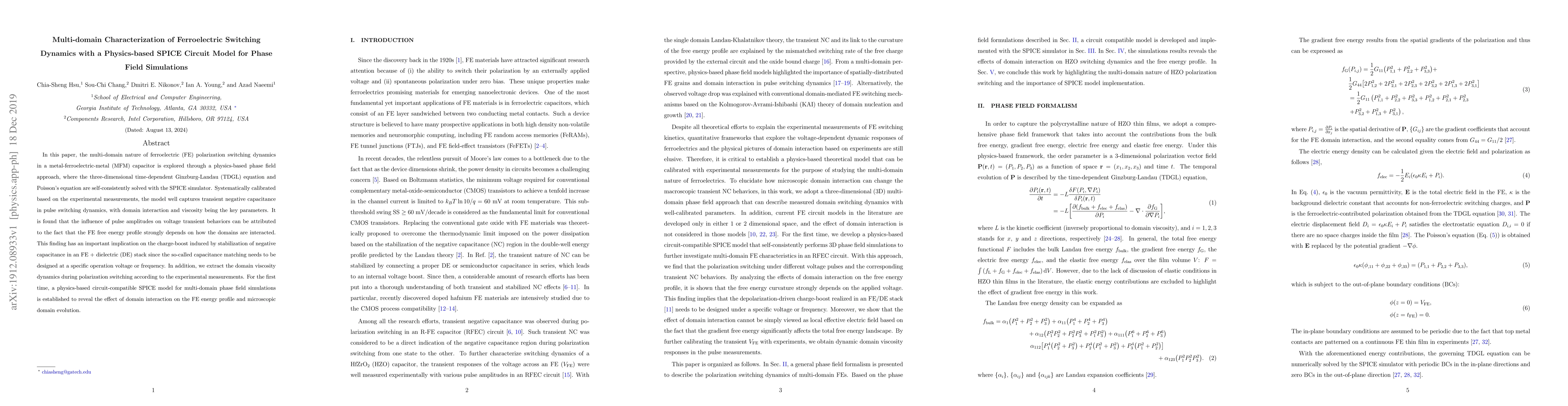 In this paper, the multi-domain nature of ferroelectric (FE) polarization switching dynamics in a metal-ferroelectric-metal (MFM) capacitor is explored through a physics-based phase field approach, where the three-dimensional time-dependent Ginzburg-Landau (TDGL) equation and Poisson's equation are self-consistently solved with the SPICE simulator. Systematically calibrated based on the experimental measurements, the model well captures transient negative capacitance in pulse switching dynamics, with domain interaction and viscosity being the key parameters. It is found that the influence of pulse amplitudes on voltage transient behaviors can be attributed to the fact that the FE free energy profile strongly depends on how the domains are interacted. This finding has an important implication on the charge-boost induced by stabilization of negative capacitance in an FE + dielectric (DE) stack since the so-called capacitance matching needs to be designed at a specific operation voltage or frequency. In addition, we extract the domain viscosity dynamics during polarization switching according to the experimental measurements. For the first time, a physics-based circuit-compatible SPICE model for multi-domain phase field simulations is established to reveal the effect of domain interaction on the FE energy profile and microscopic domain evolution.