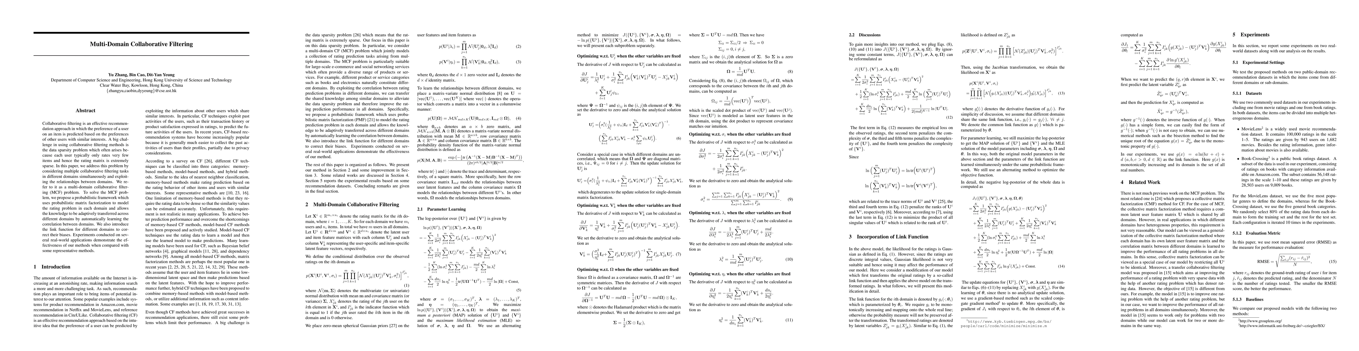 This paper proposes a multi-domain collaborative filtering approach to tackle data sparsity by leveraging relationships across different domains. The method uses probabilistic matrix factorization and adaptive knowledge transfer, with a link function to correct domain biases, and shows improved performance in real-world applications.