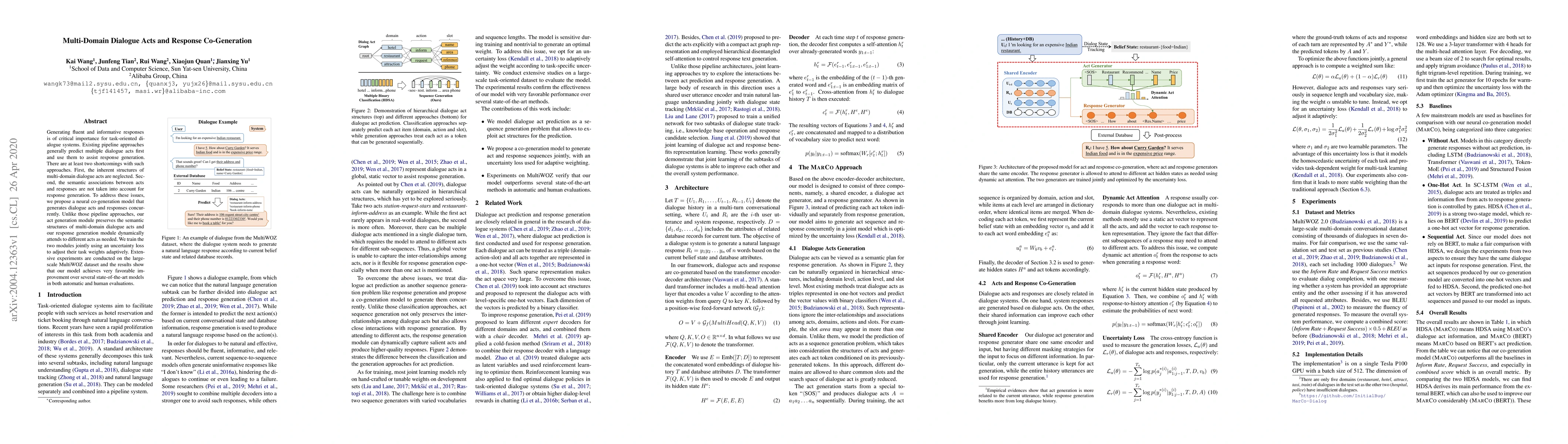 This paper proposes a neural co-generation model for multi-domain dialogue systems that concurrently generates dialogue acts and responses, addressing the shortcomings of pipeline approaches by preserving semantic structures and considering semantic associations. Experiments on the MultiWOZ dataset show significant improvements over state-of-the-art models.