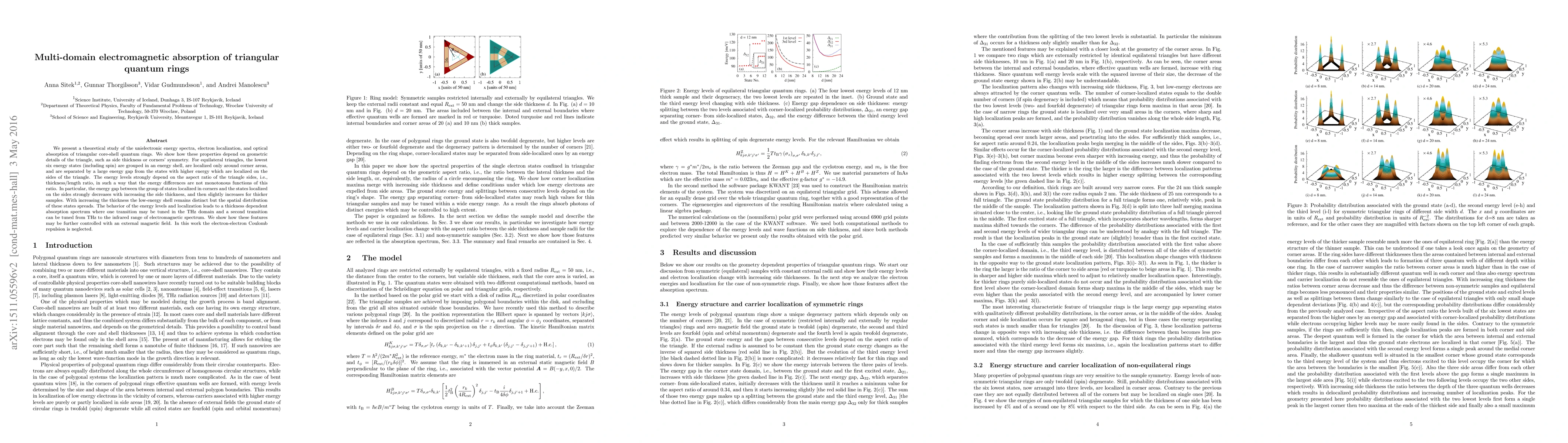 We present a theoretical study of the unielectronic energy spectra, electron localization, and optical absorption of triangular core-shell quantum rings. We show how these properties depend on geometric details of the triangle, such as side thickness or corners' symmetry. For equilateral triangles, the lowest six energy states (including spin) are grouped in an energy shell, are localized only around corner areas, and are separated by a large energy gap from the states with higher energy which are localized on the sides of the triangle. The energy levels strongly depend on the aspect ratio of the triangle sides, i.e., thickness/length ratio, in such a way that the energy differences are not monotonous functions of this ratio. In particular, the energy gap between the group of states localized in corners and the states localized on the sides strongly decreases with increasing the side thickness, and then slightly increases for thicker samples. With increasing the thickness the low-energy shell remains distinct but the spatial distribution of these states spreads. The behavior of the energy levels and localization leads to a thickness dependent absorption spectrum where one transition may be tuned in the THz domain and a second transition can be tuned from THz to the infrared range of electromagnetic spectrum. We show how these features may be further controlled with an external magnetic field. In this work the electron-electron Coulomb repulsion is neglected.