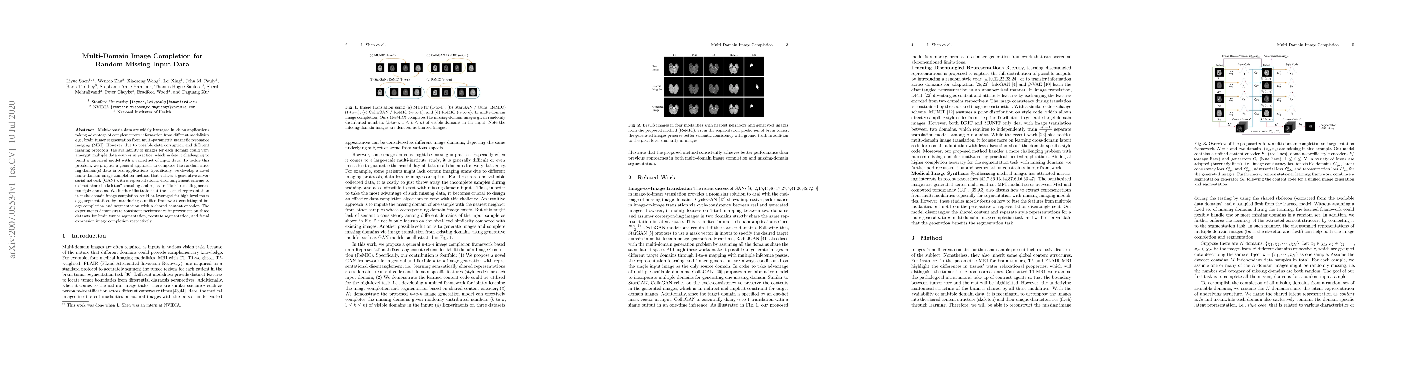 Multi-domain data are widely leveraged in vision applications taking advantage of complementary information from different modalities, e.g., brain tumor segmentation from multi-parametric magnetic resonance imaging (MRI). However, due to possible data corruption and different imaging protocols, the availability of images for each domain could vary amongst multiple data sources in practice, which makes it challenging to build a universal model with a varied set of input data. To tackle this problem, we propose a general approach to complete the random missing domain(s) data in real applications. Specifically, we develop a novel multi-domain image completion method that utilizes a generative adversarial network (GAN) with a representational disentanglement scheme to extract shared skeleton encoding and separate flesh encoding across multiple domains. We further illustrate that the learned representation in multi-domain image completion could be leveraged for high-level tasks, e.g., segmentation, by introducing a unified framework consisting of image completion and segmentation with a shared content encoder. The experiments demonstrate consistent performance improvement on three datasets for brain tumor segmentation, prostate segmentation, and facial expression image completion respectively.