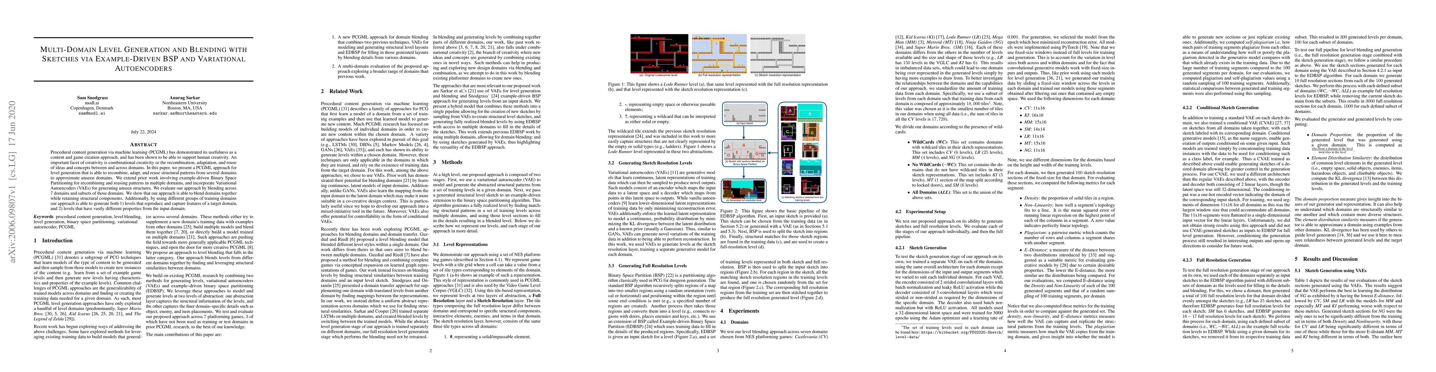 This paper introduces a procedural content generation method combining example-driven Binary Space Partitioning and Variational Autoencoders to recombine and adapt structural patterns from multiple domains. The approach successfully blends these domains to generate new levels while retaining structural components, demonstrating both domain-specific and vastly different properties.