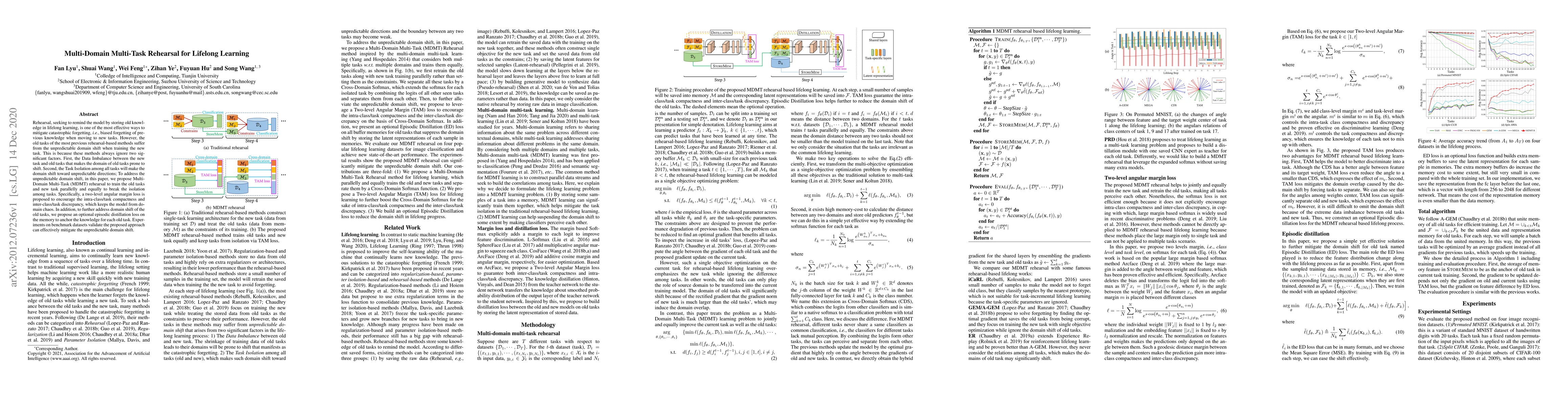 This paper proposes Multi-Domain Multi-Task (MDMT) rehearsal to mitigate catastrophic forgetting in lifelong learning by addressing data imbalance and task isolation. The approach employs a two-level angular margin loss and optional episodic distillation to maintain old task knowledge, validated through experiments showing effective reduction of unpredictable domain shifts.
