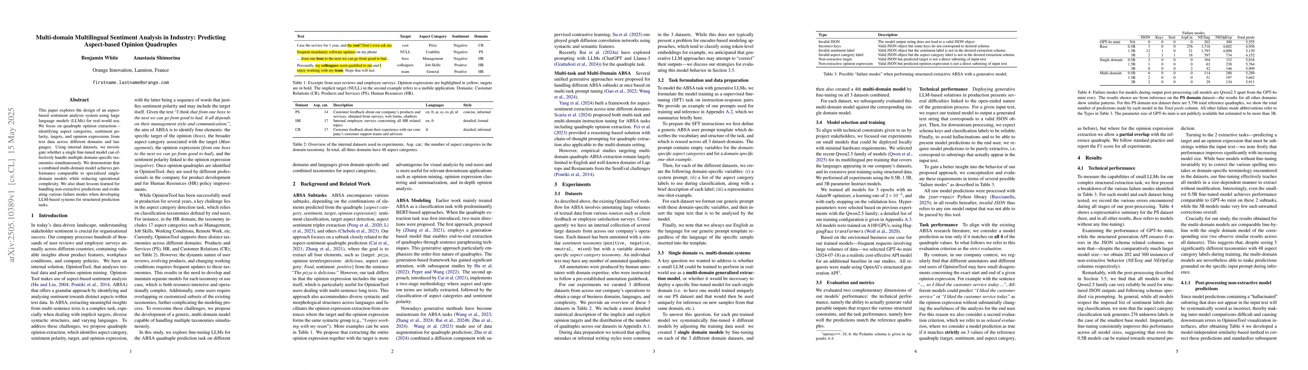 This paper explores the design of an aspect-based sentiment analysis system using large language models (LLMs) for real-world use. We focus on quadruple opinion extraction -- identifying aspect categories, sentiment polarity, targets, and opinion expressions from text data across different domains and languages. Using internal datasets, we investigate whether a single fine-tuned model can effectively handle multiple domain-specific taxonomies simultaneously. We demonstrate that a combined multi-domain model achieves performance comparable to specialized single-domain models while reducing operational complexity. We also share lessons learned for handling non-extractive predictions and evaluating various failure modes when developing LLM-based systems for structured prediction tasks.