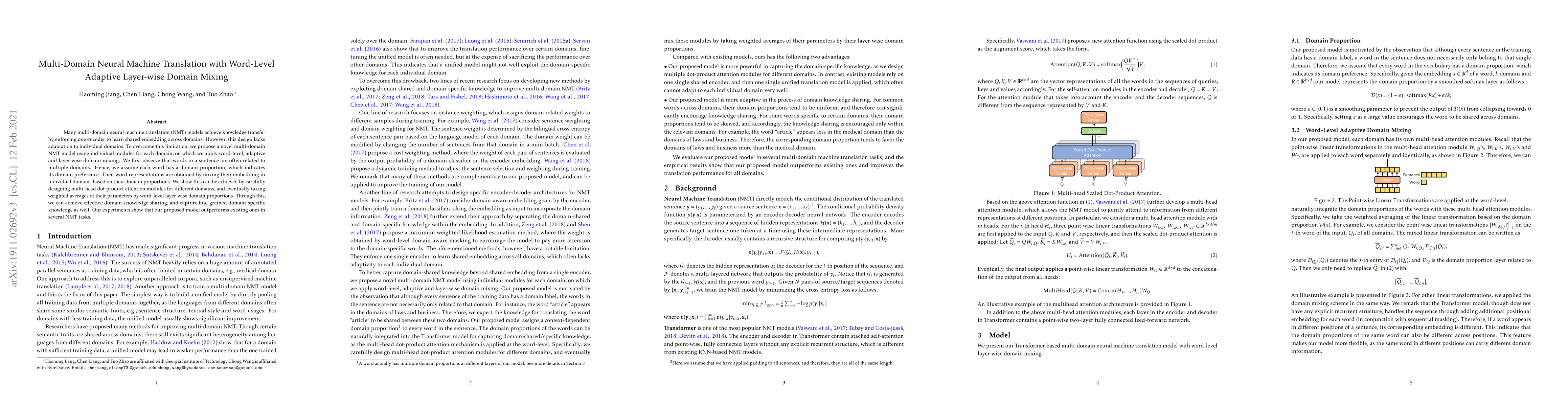 This paper proposes a novel multi-domain neural machine translation model that uses individual modules for each domain and adaptive layer-wise domain mixing based on word-level domain proportions. The model achieves effective knowledge sharing and fine-grained domain-specific knowledge capture, outperforming existing methods in various NMT tasks.