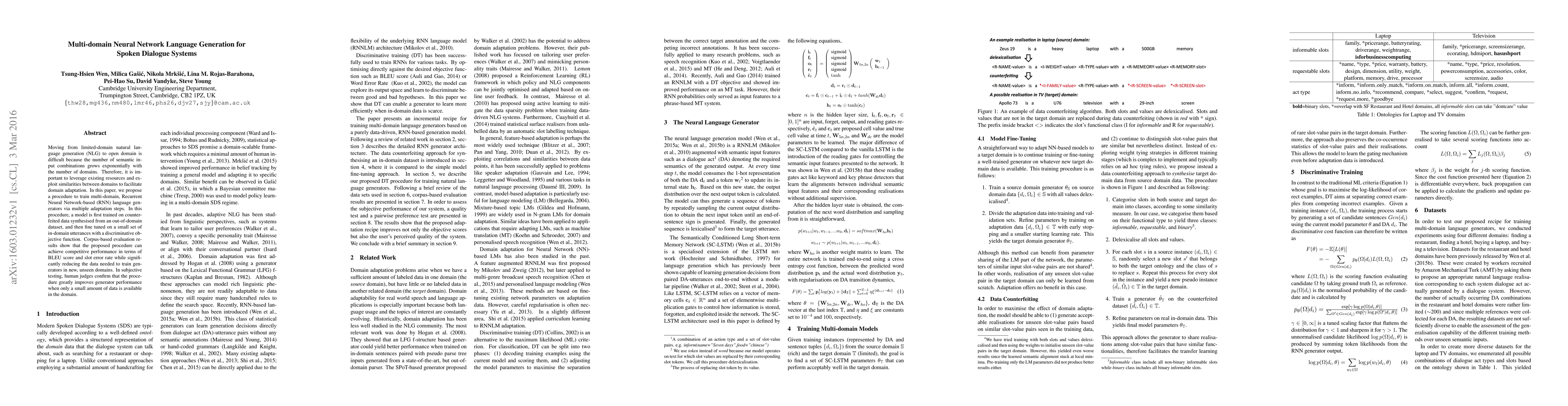 This paper proposes a multi-domain neural network approach for language generation in spoken dialogue systems, utilizing RNNs trained through synthesized counterfeit data and fine-tuned with a discriminative objective function. The method effectively reduces data requirements for new domains, achieving competitive performance in automated metrics and improved human-judged quality.