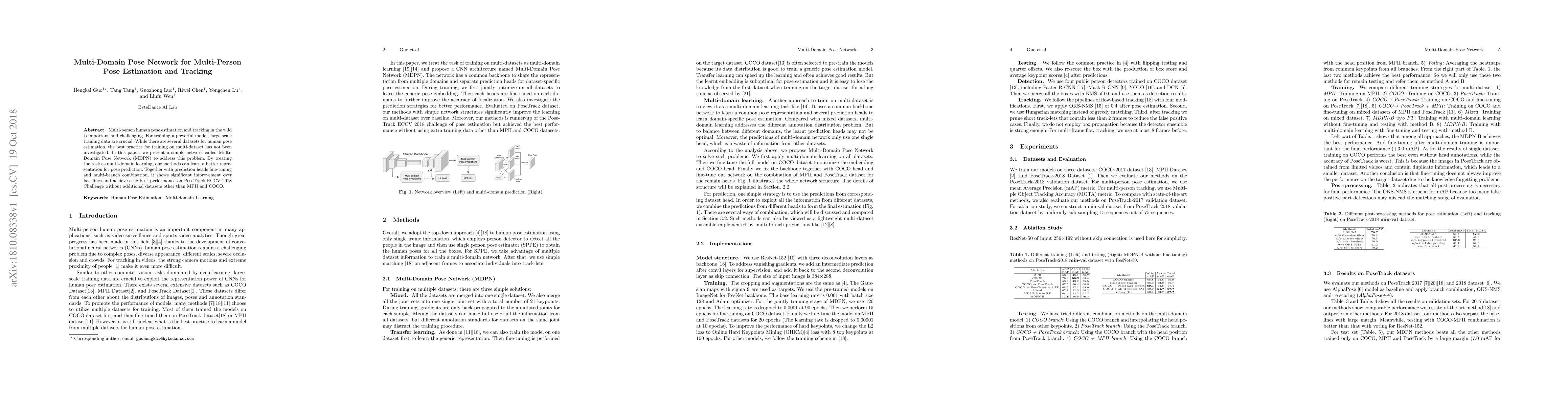 Multi-person human pose estimation and tracking in the wild is important and challenging. For training a powerful model, large-scale training data are crucial. While there are several datasets for human pose estimation, the best practice for training on multi-dataset has not been investigated. In this paper, we present a simple network called Multi-Domain Pose Network (MDPN) to address this problem. By treating the task as multi-domain learning, our methods can learn a better representation for pose prediction. Together with prediction heads fine-tuning and multi-branch combination, it shows significant improvement over baselines and achieves the best performance on PoseTrack ECCV 2018 Challenge without additional datasets other than MPII and COCO.