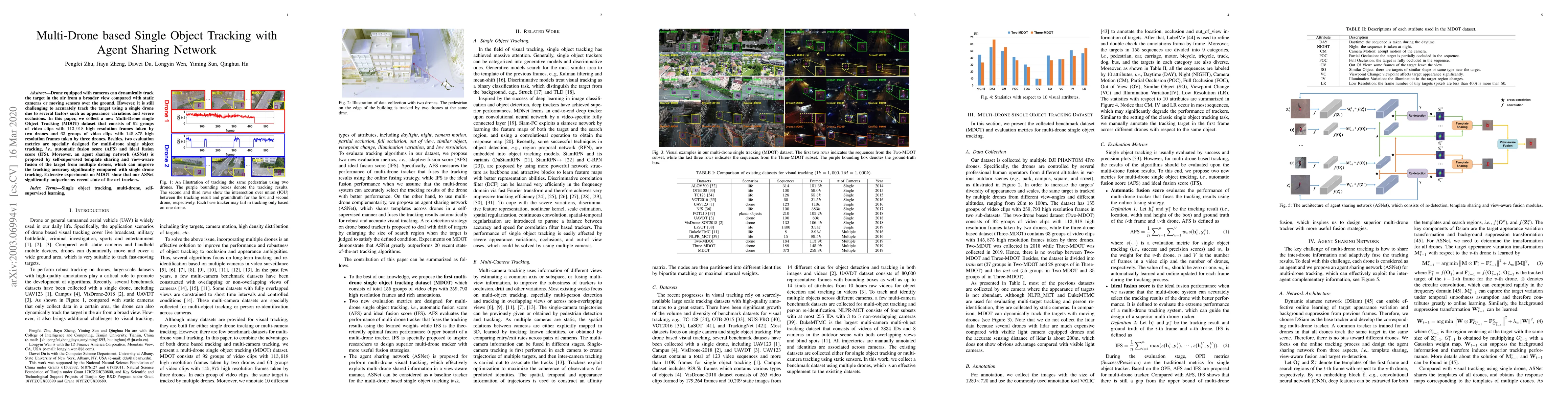 This paper introduces a new Multi-Drone single Object Tracking (MDOT) dataset and proposes an agent sharing network (ASNet) to improve tracking accuracy by leveraging self-supervised template sharing and view-aware fusion from multiple drones. ASNet significantly outperforms recent state-of-the-art trackers in extensive experiments.