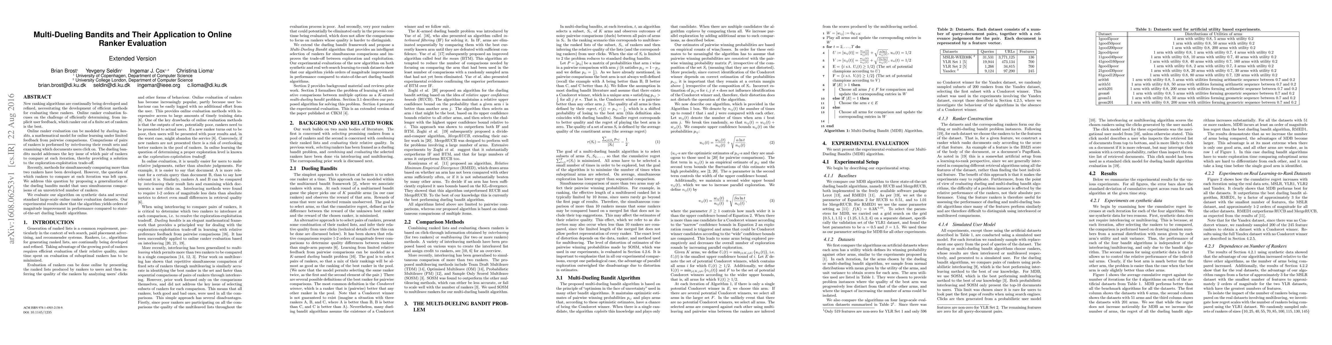 New ranking algorithms are continually being developed and refined, necessitating the development of efficient methods for evaluating these rankers. Online ranker evaluation focuses on the challenge of efficiently determining, from implicit user feedback, which ranker out of a finite set of rankers is the best. Online ranker evaluation can be modeled by dueling ban- dits, a mathematical model for online learning under limited feedback from pairwise comparisons. Comparisons of pairs of rankers is performed by interleaving their result sets and examining which documents users click on. The dueling bandits model addresses the key issue of which pair of rankers to compare at each iteration, thereby providing a solution to the exploration-exploitation trade-off. Recently, methods for simultaneously comparing more than two rankers have been developed. However, the question of which rankers to compare at each iteration was left open. We address this question by proposing a generalization of the dueling bandits model that uses simultaneous comparisons of an unrestricted number of rankers. We evaluate our algorithm on synthetic data and several standard large-scale online ranker evaluation datasets. Our experimental results show that the algorithm yields orders of magnitude improvement in performance compared to stateof- the-art dueling bandit algorithms.