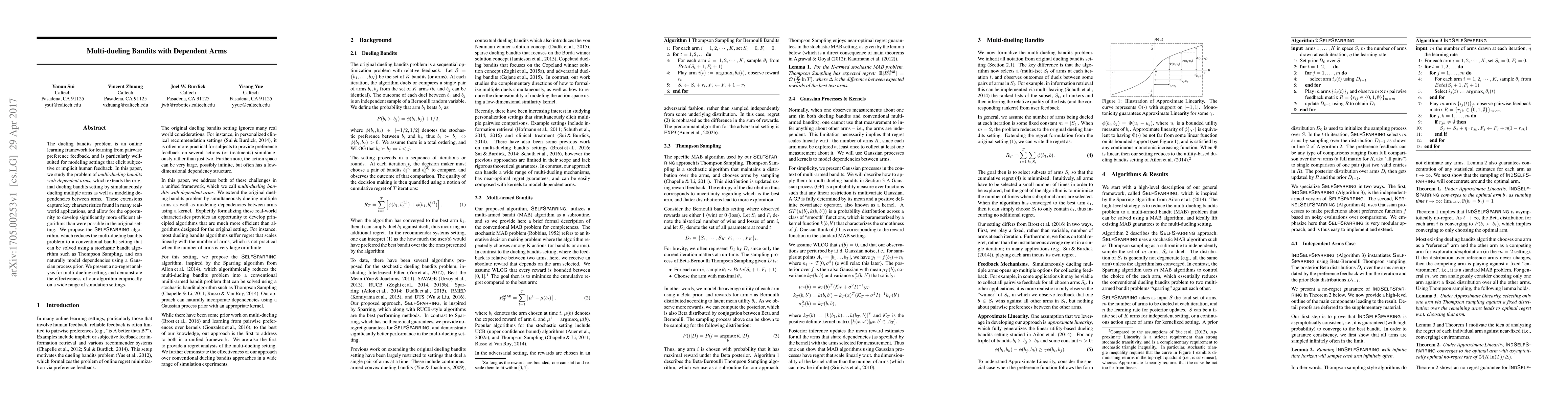 This paper extends the dueling bandits framework to handle multi-dueling with dependent arms, proposing the self-sparring algorithm to manage this complexity. The algorithm reduces the problem to a conventional bandit setting and employs a Gaussian process to model arm dependencies, achieving better efficiency and performance.