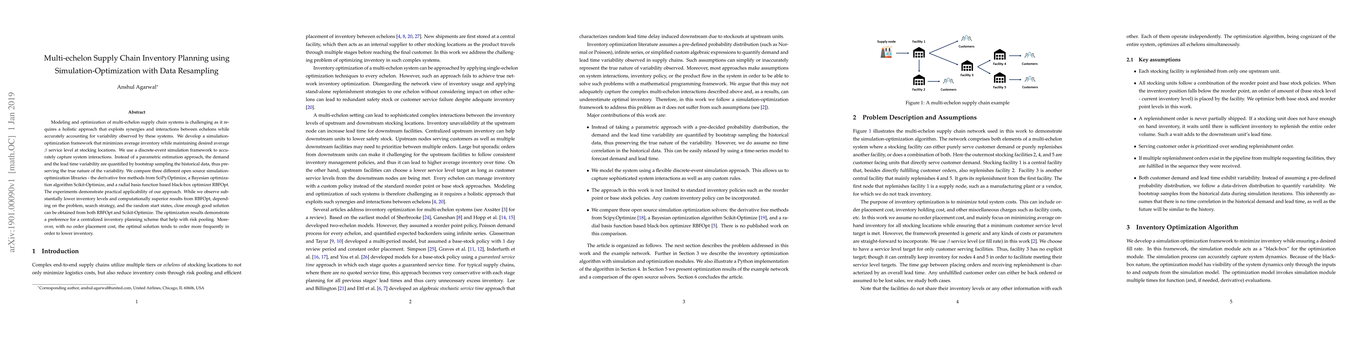 This paper develops a simulation-optimization framework for multi-echelon supply chain inventory planning using data resampling to capture demand and lead time variability. The study compares three optimization libraries, showing RBFOpt provides the best results, but good solutions can also be obtained from other methods, favoring a centralized planning scheme for risk pooling.