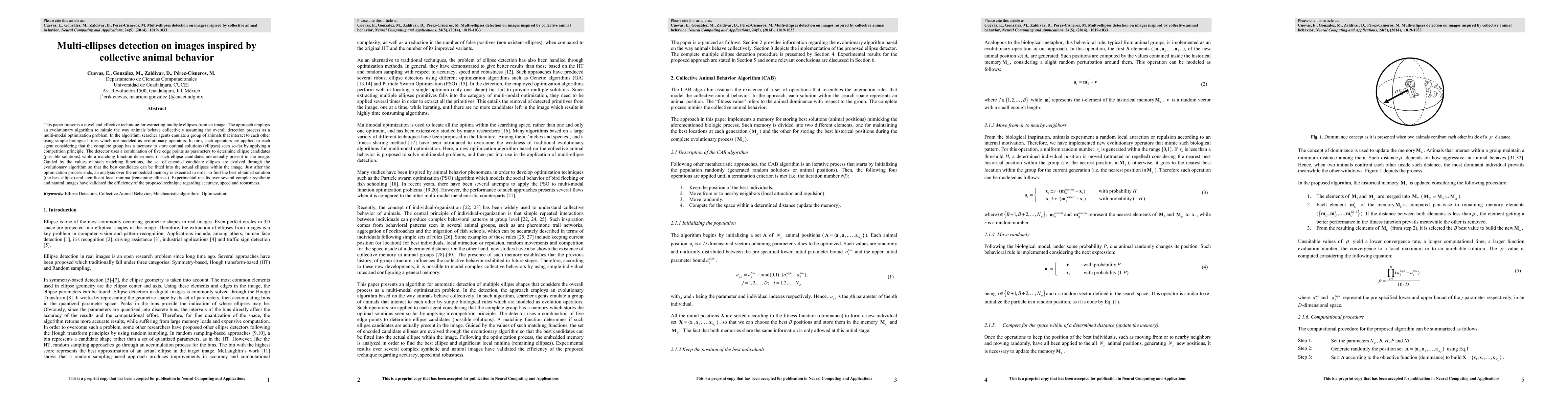 This paper introduces an innovative method for detecting multiple ellipses in images, inspired by collective animal behavior, using an evolutionary algorithm that mimics group interactions to solve a multi-modal optimization problem. Experimental results show the technique's accuracy, speed, and robustness in identifying ellipses in complex images.