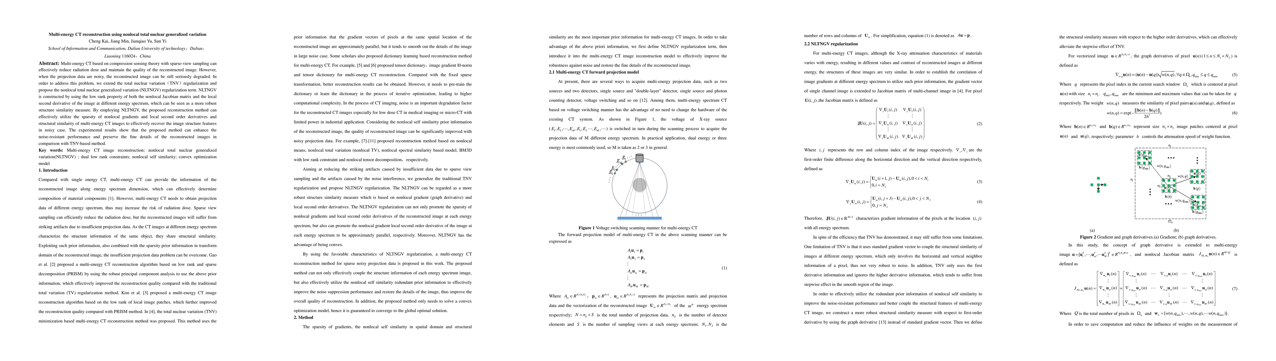 This paper proposes a nonlocal total nuclear generalized variation (NLTNGV) regularization term to improve multi-energy CT reconstruction under sparse-view sampling and noise conditions. The NLTNGV leverages the low rank properties of nonlocal Jacobian matrices and local second derivatives to enhance noise resistance and detail preservation, outperforming traditional total nuclear variation (TNV) methods.