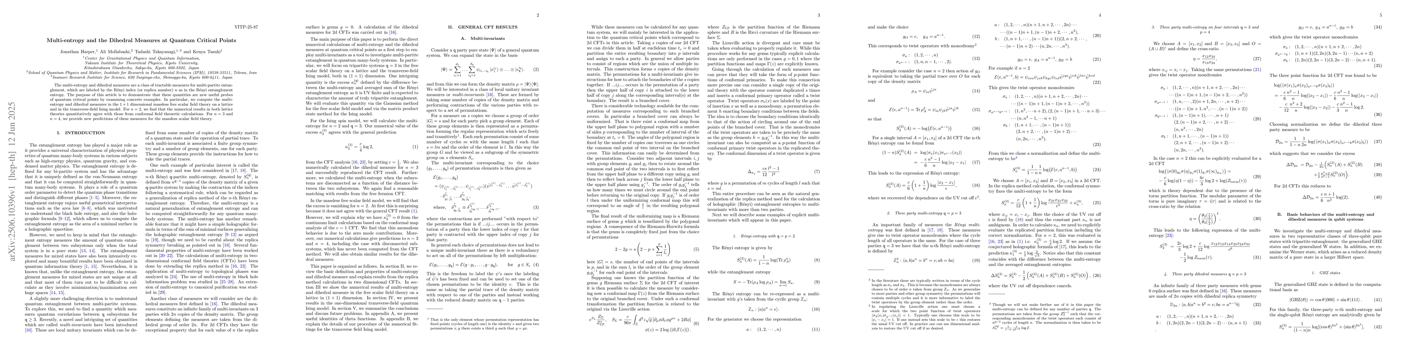 The multi-entropy and dihedral measures are a class of tractable measures for multi-partite entanglement, which are labeled by the R\'enyi index (or replica number) $n$ as in the R\'enyi entanglement entropy. The purpose of this article is to demonstrate that these quantities are new useful probes of quantum critical points by examining concrete examples. In particular, we compute the multi-entropy and dihedral measures in the $1+1$ dimensional massless free scalar field theory on a lattice and in the transverse-field Ising model. For $n=2$, we find that the numerical results in both lattice theories quantitatively agree with those from conformal field theoretic calculations. For $n=3$ and $n=4$, we provide new predictions of these measures for the massless scalar field theory.