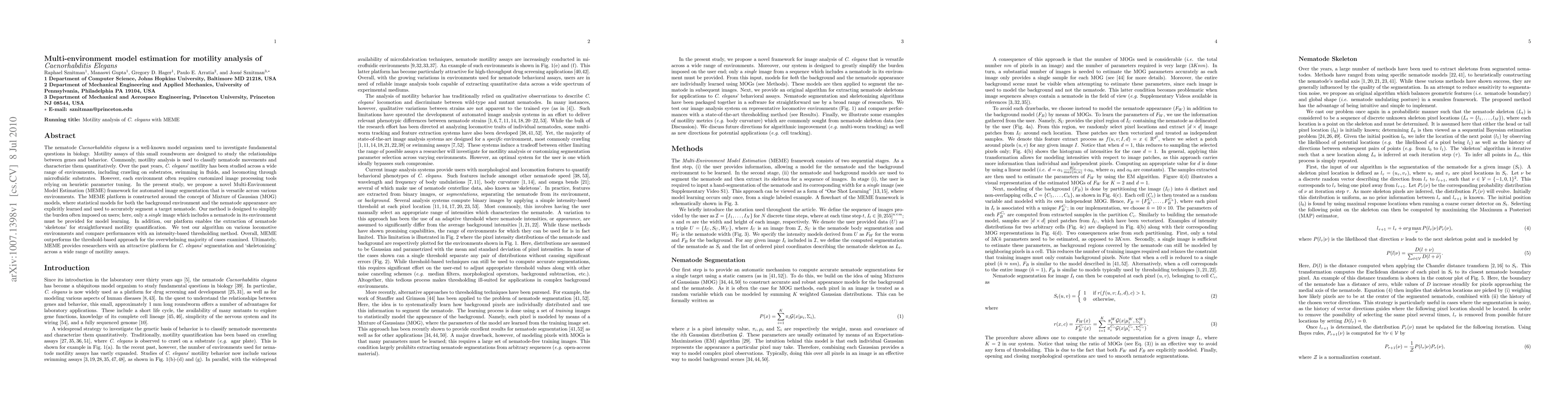 This paper introduces a Multi-Environment Model Estimation (MEME) framework for automated image segmentation of Caenorhabditis elegans across various environments, including crawling, swimming, and microfluidic locomotion. The MEME platform, based on Mixture of Gaussian models, simplifies the segmentation process and outperforms traditional thresholding methods, offering a robust tool for motility analysis.