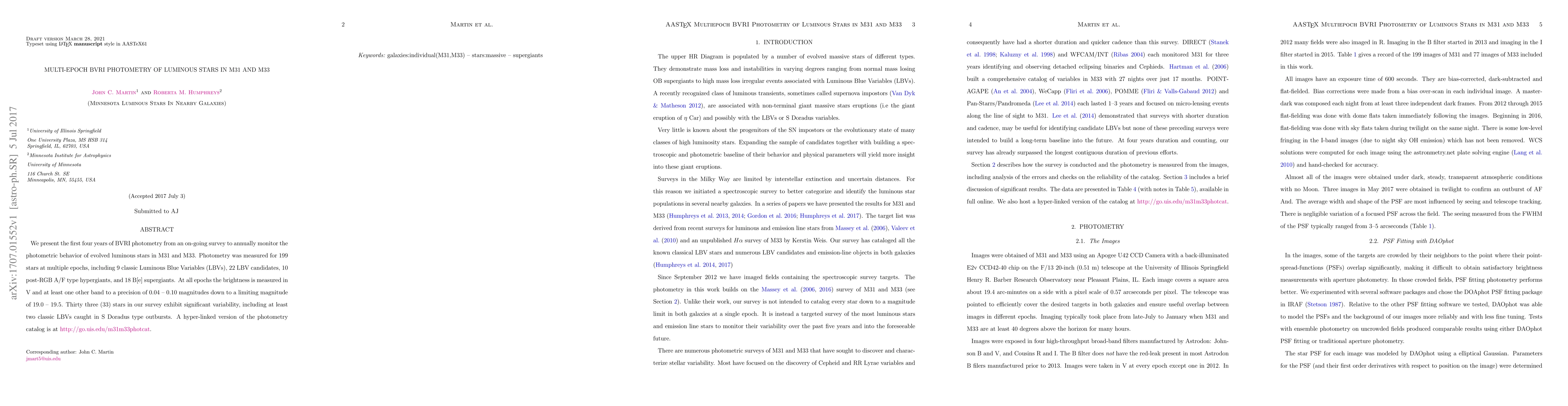 We present the first four years of BVRI photometry from an on-going survey to annually monitor the photometric behavior of evolved luminous stars in M31 and M33. Photometry was measured for 199 stars at multiple epochs, including 9 classic Luminous Blue Variables (LBVs), 22 LBV candidates, 10 post-RGB A/F type hypergiants, and 18 B[e] supergiants. At all epochs the brightness is measured in V and at least one other band to a precision of 0.04 -- 0.10 magnitudes down to a limiting magnitude of 19.0 -- 19.5. Thirty three (33) stars in our survey exhibit significant variability, including at least two classic LBVs caught in S Doradus type outbursts. A hyper-linked version of the photometry catalog is at: http://go.uis.edu/m31m33photcat/.