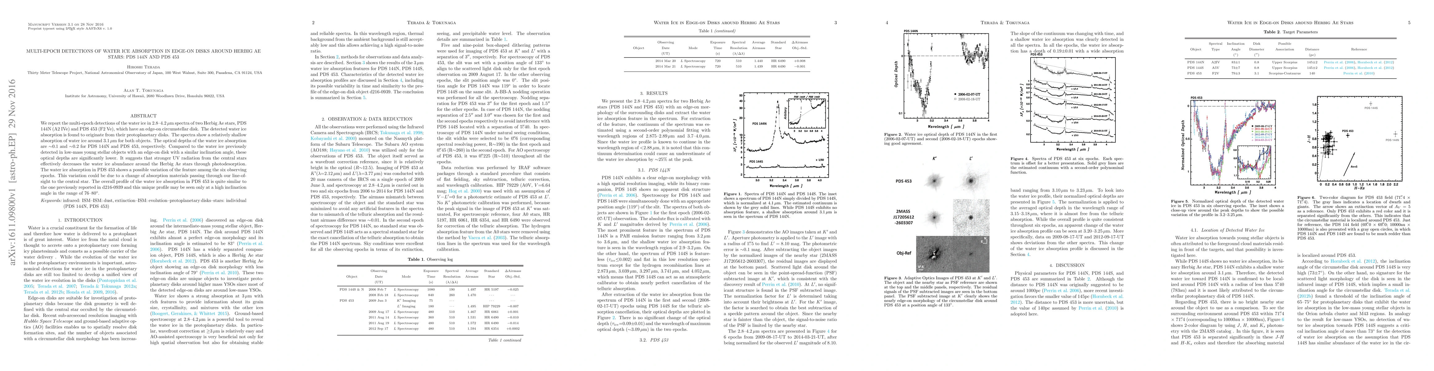 We report the multi-epoch detections of the water ice in 2.8-4.2 micron spectra of two Herbig Ae stars, PDS 144N (A2 IVe) and PDS 453 (F2 Ve), which have an edge-on circumstellar disk. The detected water ice absorption is found to originate from their protoplanetary disks. The spectra show a relatively shallow absorption of water ice around 3.1 micron for both objects. The optical depths of the water ice absorption are ~0.1 and ~0.2 for PDS 144N and PDS 453, respectively. Compared to the water ice previously detected in low-mass young stellar objects with an edge-on disk with a similar inclination angle, these optical depths are significantly lower. It suggests that stronger UV radiation from the central stars effectively decreases the water ice abundance around the Herbig Ae stars through photodesorption. The water ice absorption in PDS 453 shows a possible variation of the feature among the six observing epochs. This variation could be due to a change of absorption materials passing through our line-of-sight to the central star.