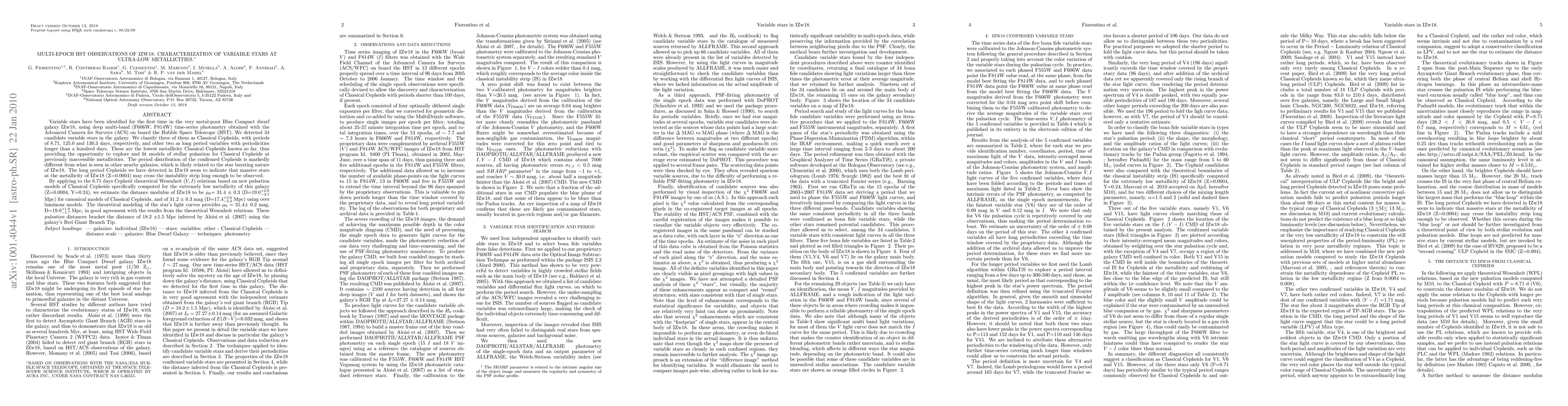 Variable stars have been identified for the first time in the very metal-poor Blue Compact dwarf galaxy IZw18, using deep multi-band (F606W, F814W)time-series photometry obtained with the Advanced Camera for Surveys (ACS) on board the Hubble Space Telescope (HST). We detected 34 candidate variable stars in the galaxy. We classify three of them as Classical Cepheids, with periods of 8.71, 125.0 and 130.3 days, respectively, and other two as long period variables with periodicities longer than a hundred days. These are the lowest metallicity Classical Cepheids known so far, thus providing the opportunity to explore and fit models of stellar pulsation fo Classical Cepheids at previously inaccessible metallicities. The period distribution of the confirmed Cepheids is markedly different from what is seen in other nearby galaxies, which is likely related to the star bursting nature of IZw18. By applying to the 8.71 days Cepheid theoretical Wesenheit (V,I) relations based on new pulsation models of Classical Cepheids specifically computed for the extremely low metallicity of this galaxy (Z=0.0004, Y=0.24), we estimate the distance modulus of IZw18 to be mu_0= 31.4pm0.2 D=19.0^{+1.8}_{-1.7}Mpc) for canonical models of Classical Cepheids, and of 31.2pm0.2 mag (D=17.4^{+1.6}_{-1.6}Mpc) using over luminous models. The theoretical modeling of the star's light curves provides mu_0=31.4pm0.1 mag, D=19.0^{+0.9}_{-0.9} Mpc, in good agreement with the results from the theoretical Wesenheit relations. These pulsation distances bracket the distance of 18.2pm1.5Mpc inferred by Aloisi et al. (2007) using the galaxy's Red Giant Branch Tip.